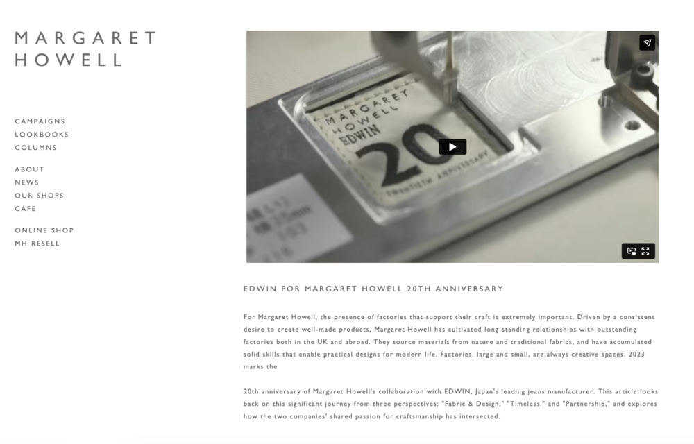 "마거릿 하웰과 함께 일할 때 우리가 염두에 두는 것은 진정성입니다. 색의 깊이를 살리기 위해서는 실, 염색, 핏, 패턴, 바느질, 마무리(세탁) 등 원재료의 모든 요소가 진정성을 가져야 합니다. 마가렛 하웰의 매력은 '변화에도 변하지 않는 신선함'에 있다고 생각하며, 이 신선함을 이루는 열쇠는 디테일에 대한 철저한 주의가 있다고 생각합니다. 이것은 에드윈도 공유하는 부분이기 때문에 타협 없이 수년간 지속되어 온 것이라고 생각합니다."