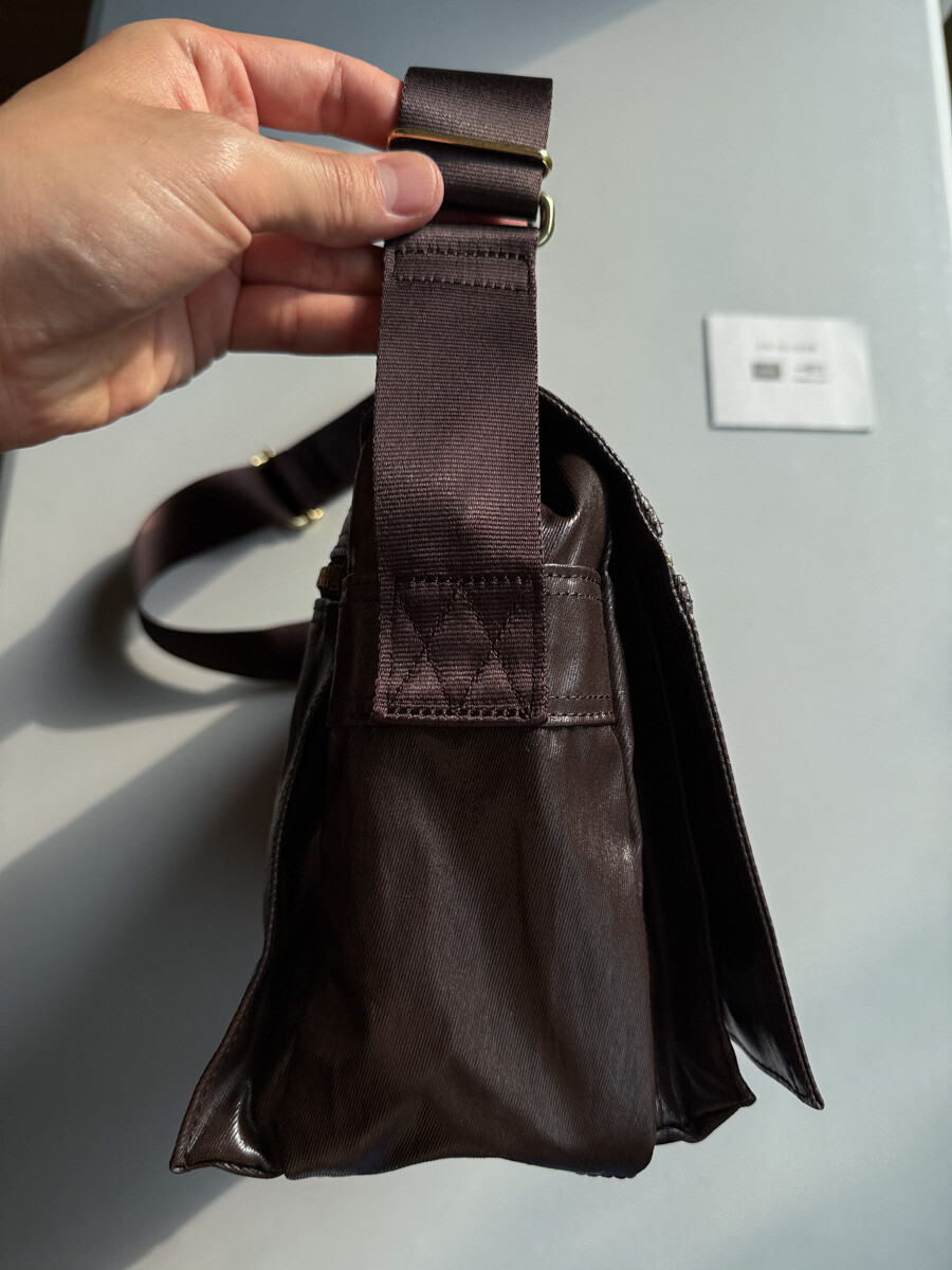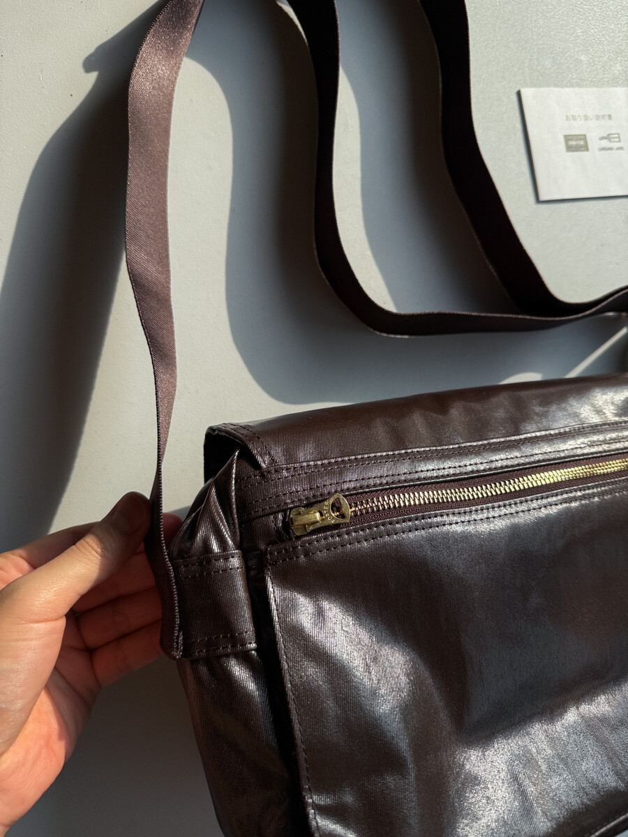 액체 염색(※1)으로 주름진 나일론 바탕에 알루미늄 분말을 섞은 안료 코팅을 함으로써 생기는 독특한 광택과 질감이 있는 오리지널 원단이 가장 큰 매력입니다.장인의 고도의 연마 가공(폴리시)으로 마감된 금구나 지퍼가 내뿜는 고급스러운 광택감과의 대비도 포인트.