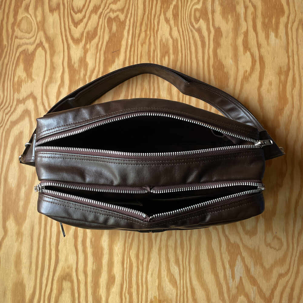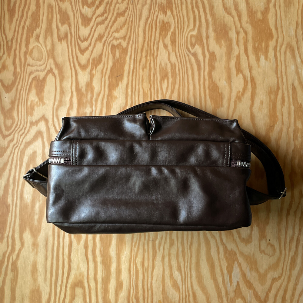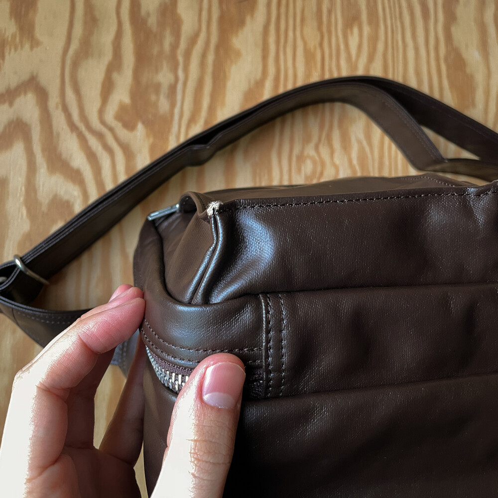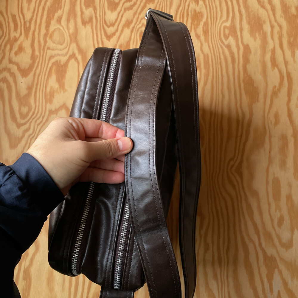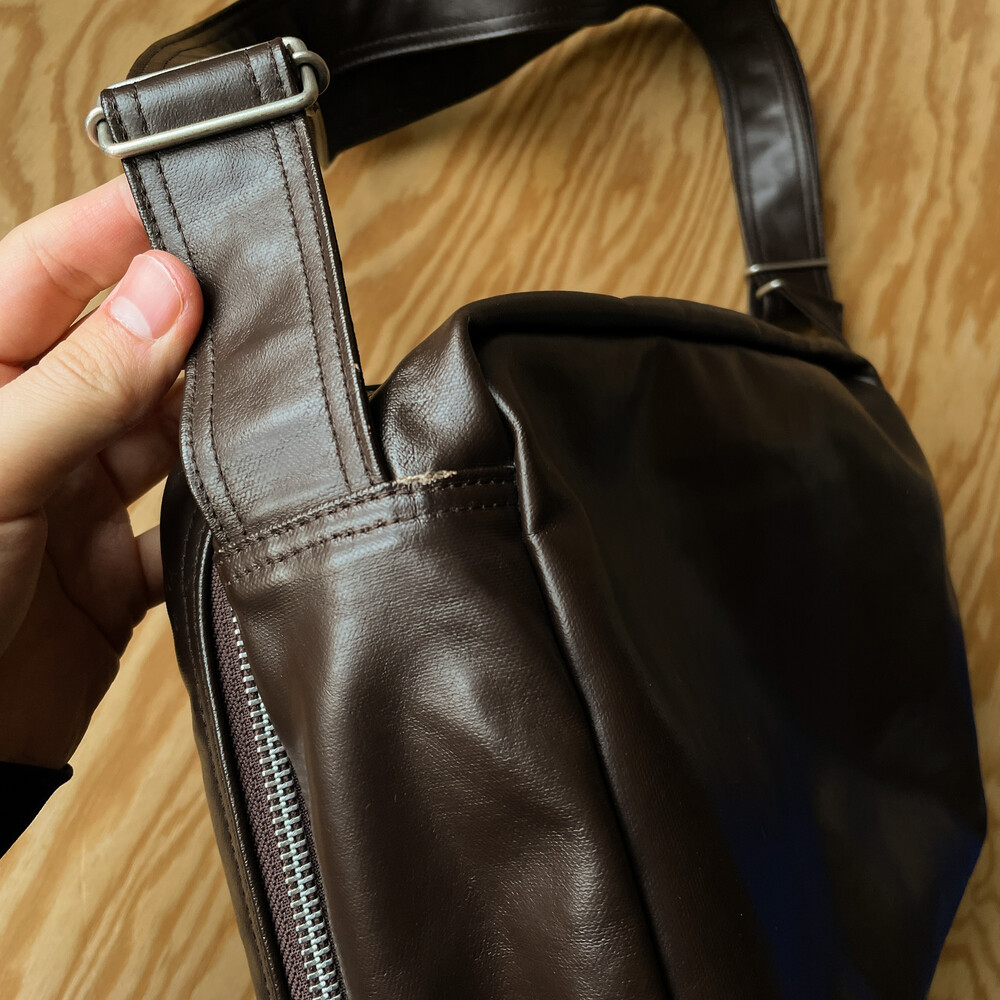후염색을 통해 원단을 수축시켜 독특한 질감을 표현했으며, 제품으로 만든 후에는 가방을 문질러 적당한 구김을 주기 위해 마무리했습니다. 일반 원단과 다르게 생겼고 가죽처럼 보이는 독특한 질감의 원단입니다.