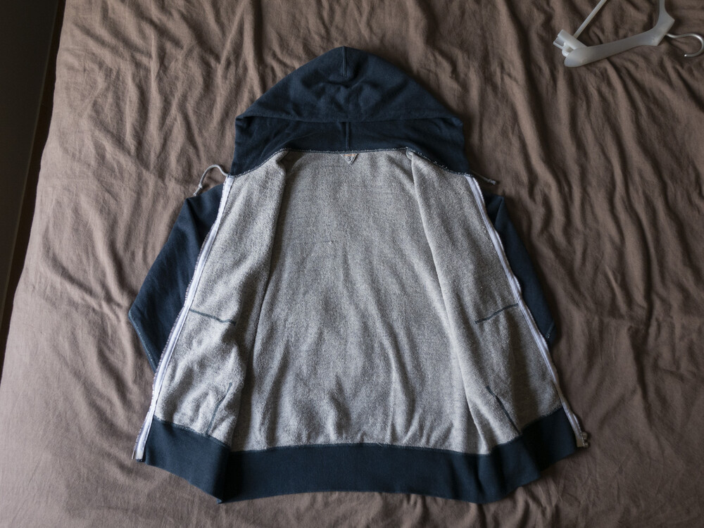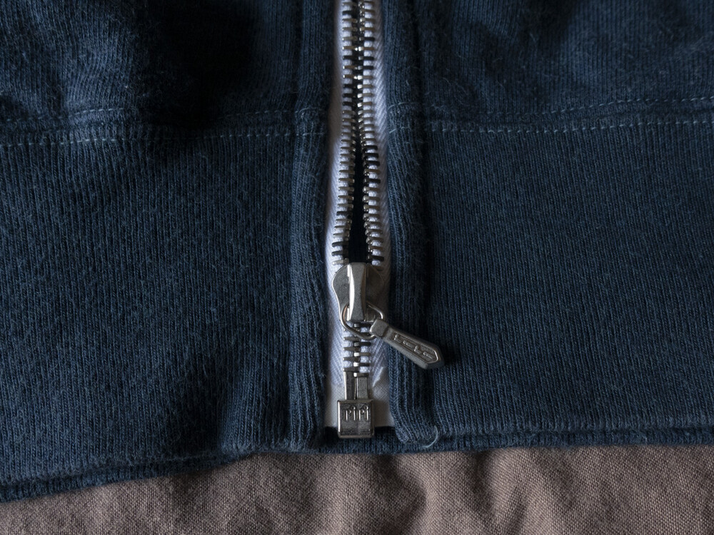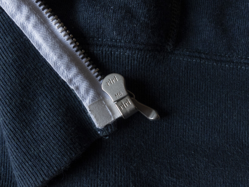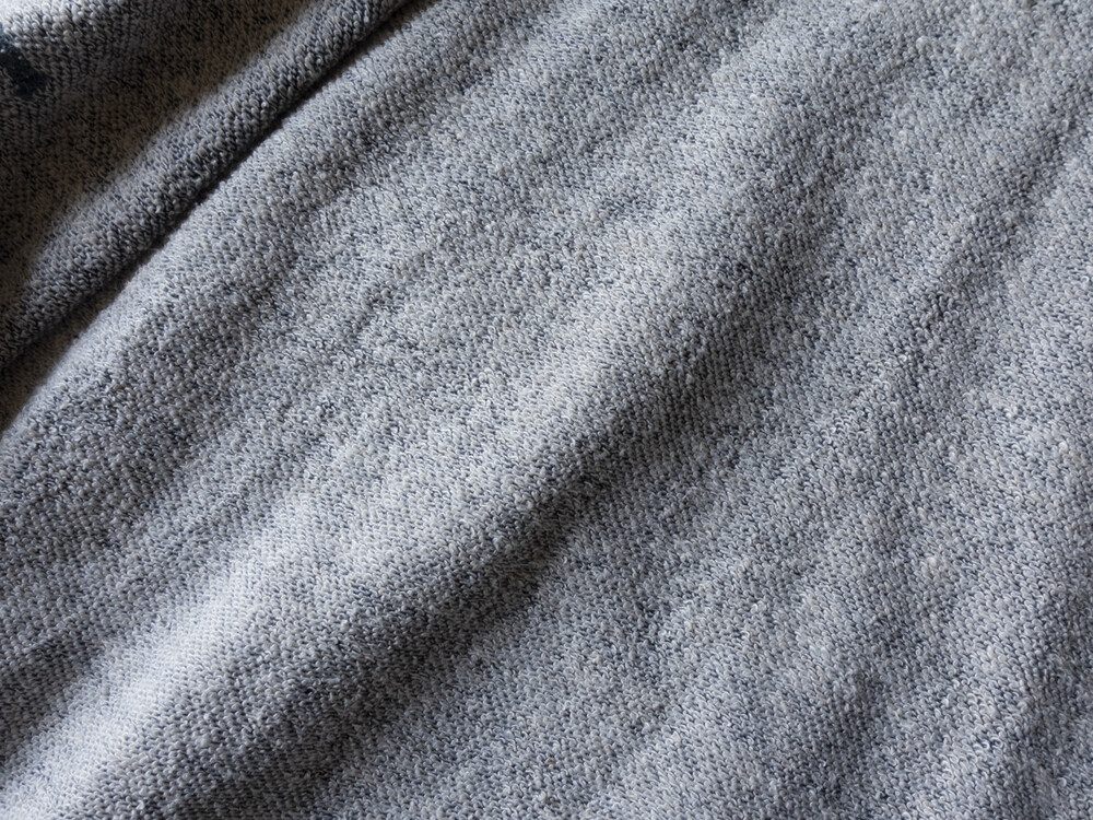 1950년대부터 고즈넉하게 남아있는 '매다는 뜨개질기'로 원단을 생산하고 있어 실에 부담을 주지 않고 중력에 의해 떨어지는 힘만으로 짜여나가기 때문에 '공기를 함께 엮고 있는' 것처럼 통통하고 부드러운 탄력이 있는 원단이 가능합니다. 세탁 등으로 인한 모양새가 쉽게 흐트러지지 않으며 원단의 탄력도 잃지 않습니다.