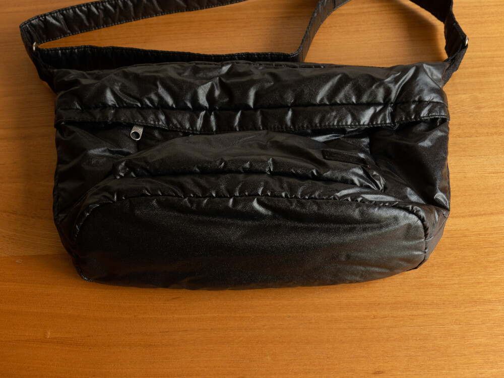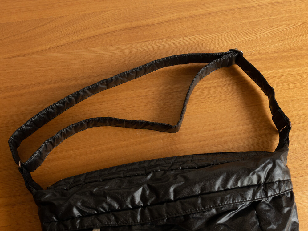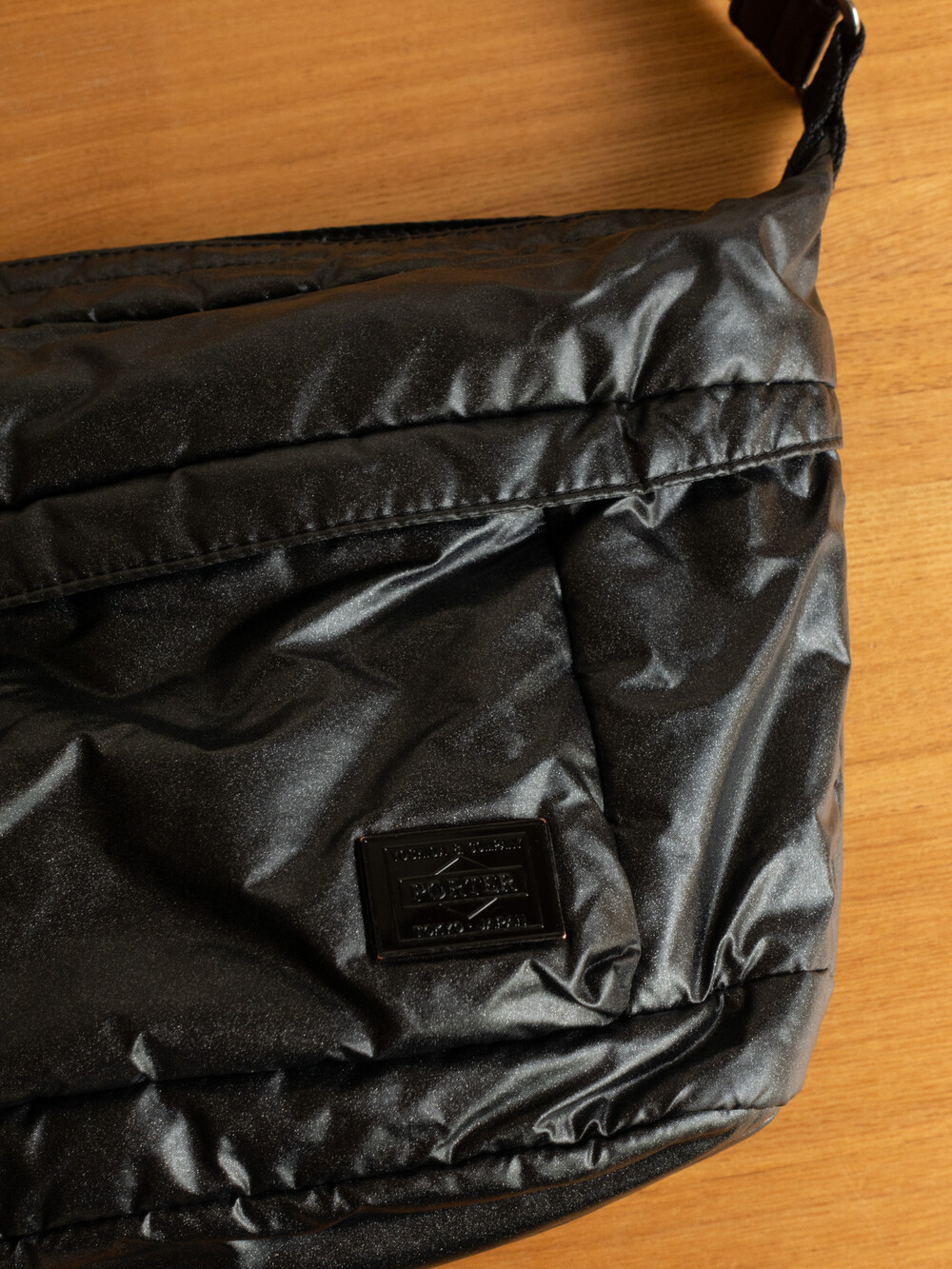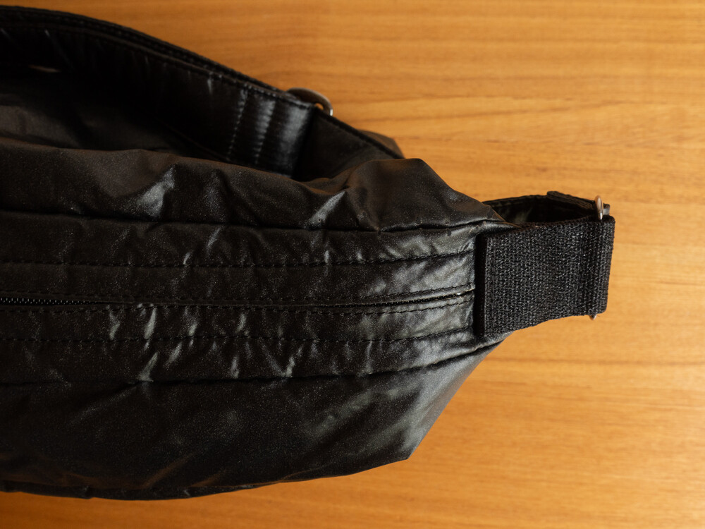 나일론 원단에 투명 폴리우레탄 코팅, 또한 블루와 레드의 광채 펄 가공을 이중으로 실시, 다시 폴리우레탄 코팅했습니다.