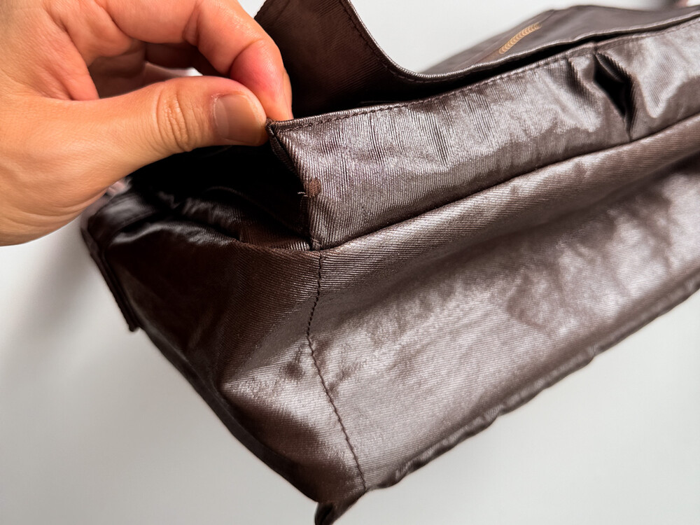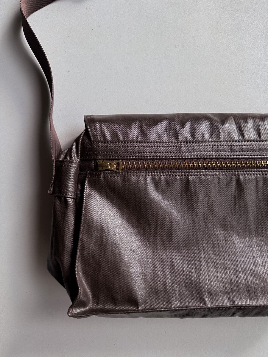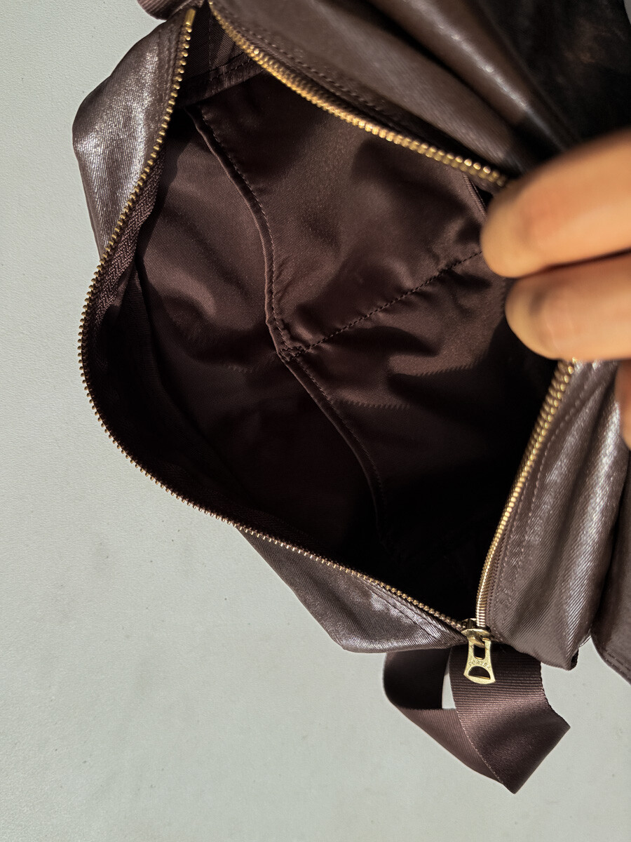 액체 염색(※1)으로 주름진 나일론 바탕에 알루미늄 분말을 섞은 안료 코팅을 함으로써 생기는 독특한 광택과 질감이 있는 오리지널 원단이 가장 큰 매력입니다.장인의 고도의 연마 가공(폴리시)으로 마감된 금구나 지퍼가 내뿜는 고급스러운 광택감과의 대비도 포인트.