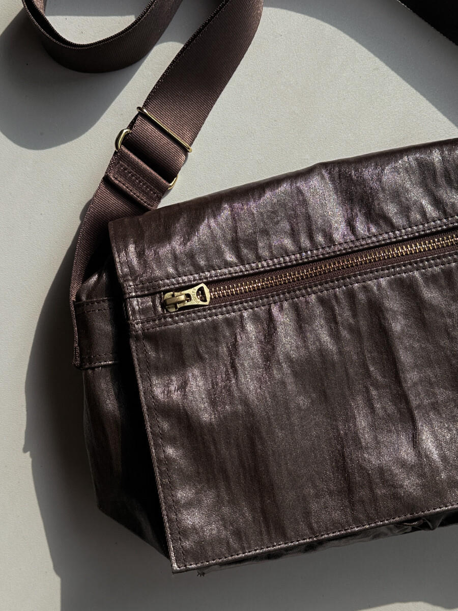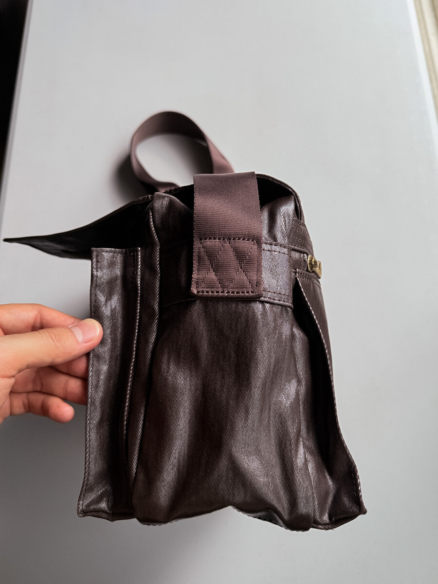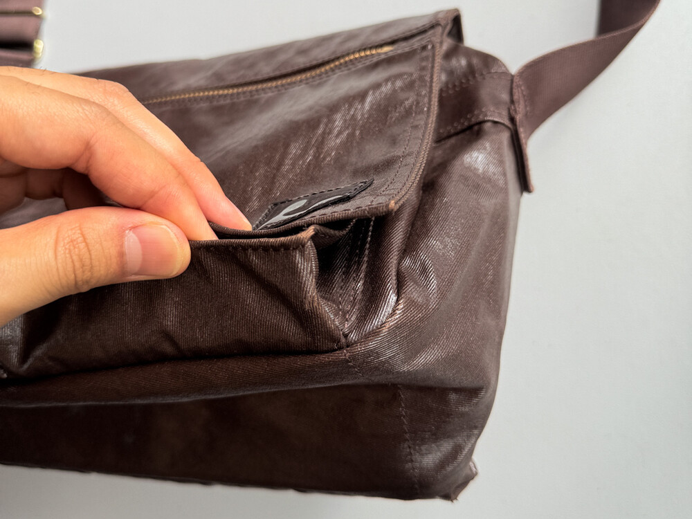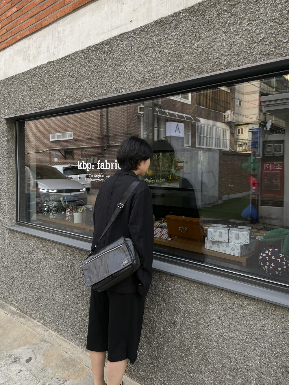액체 염색(※1)으로 주름진 나일론 바탕에 알루미늄 분말을 섞은 안료 코팅을 함으로써 생기는 독특한 광택과 질감이 있는 오리지널 원단이 가장 큰 매력입니다.장인의 고도의 연마 가공(폴리시)으로 마감된 금구나 지퍼가 내뿜는 고급스러운 광택감과의 대비도 포인트.