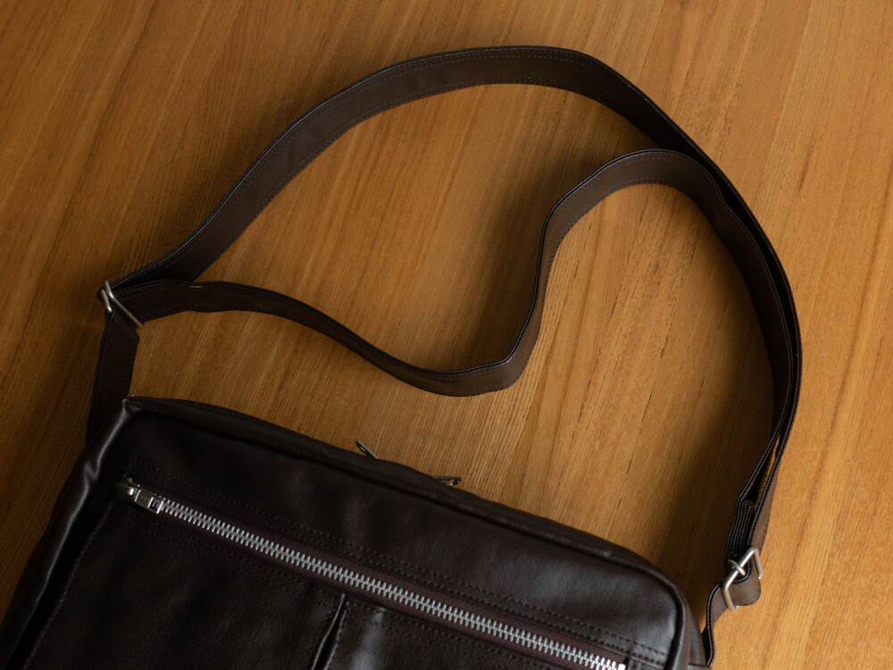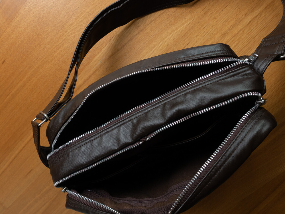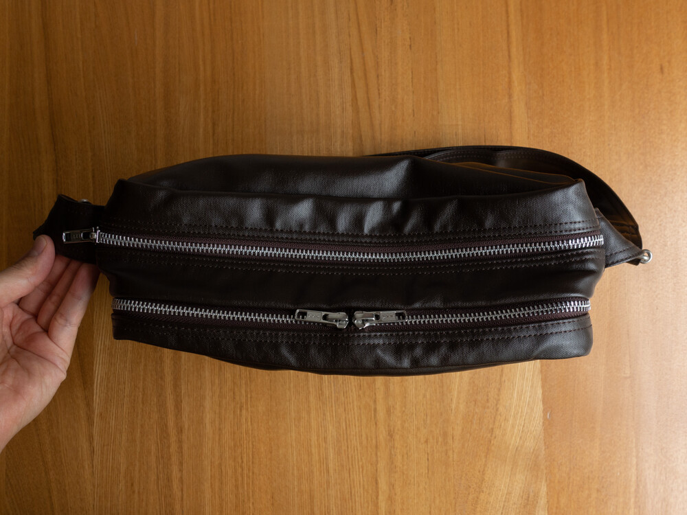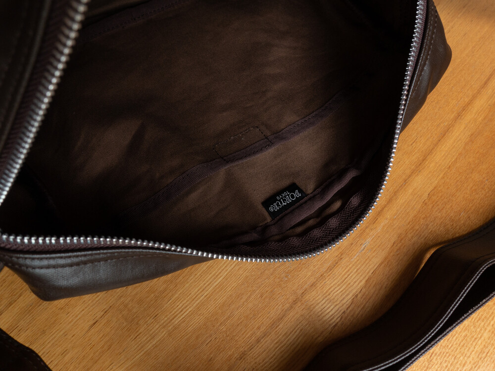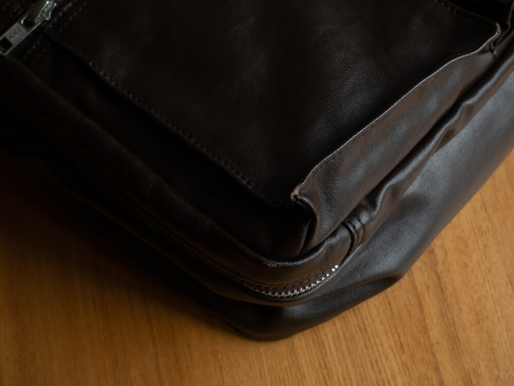 후염색을 통해 원단을 수축시켜 독특한 질감을 표현했으며, 제품으로 만든 후에는 가방을 문질러 적당한 구김을 주기 위해 마무리했습니다. 일반 원단과 다르게 생겼고 가죽처럼 보이는 독특한 질감의 원단입니다.
