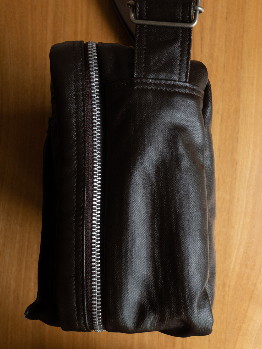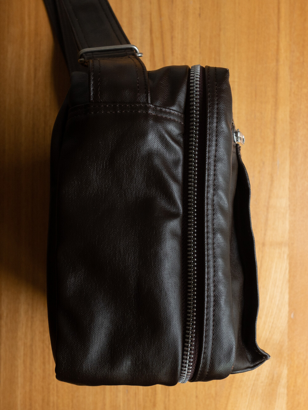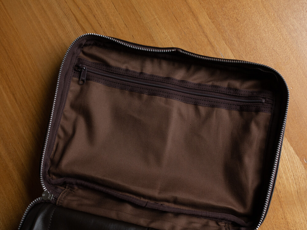 후염색을 통해 원단을 수축시켜 독특한 질감을 표현했으며, 제품으로 만든 후에는 가방을 문질러 적당한 구김을 주기 위해 마무리했습니다. 일반 원단과 다르게 생겼고 가죽처럼 보이는 독특한 질감의 원단입니다.