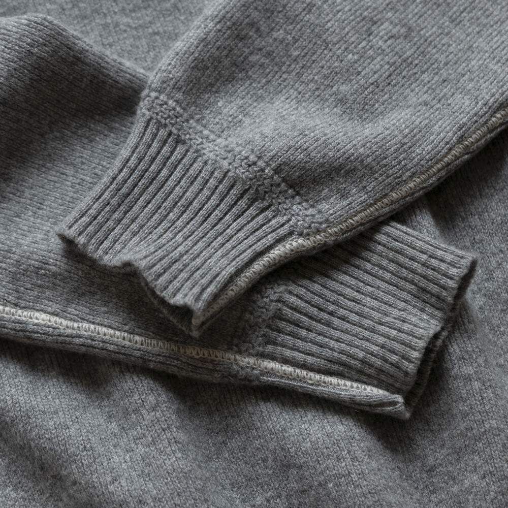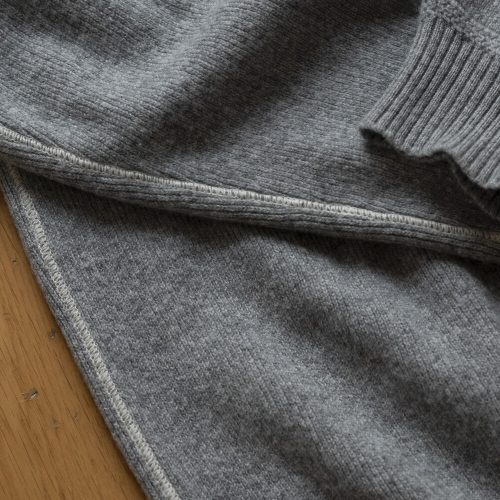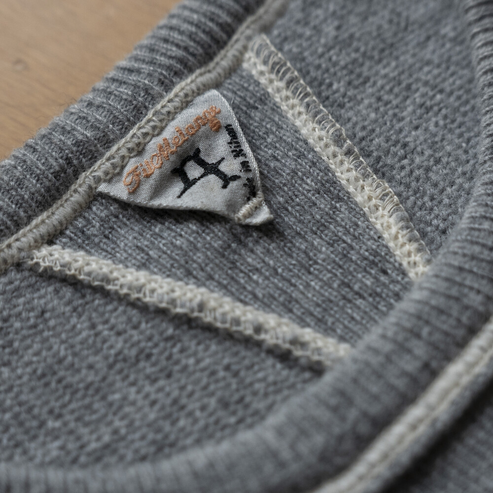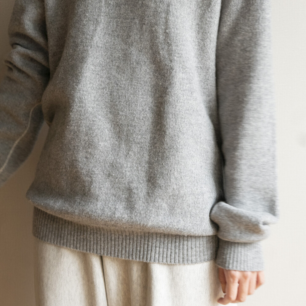 1950년대부터 고즈넉하게 남아있는 '매다는 뜨개질기'로 원단을 생산하고 있어 실에 부담을 주지 않고 중력에 의해 떨어지는 힘만으로 짜여나가기 때문에 '공기를 함께 엮고 있는' 것처럼 통통하고 부드러운 탄력이 있는 원단이 가능합니다. 세탁 등으로 인한 모양새가 쉽게 흐트러지지 않으며 원단의 탄력도 잃지 않습니다.
