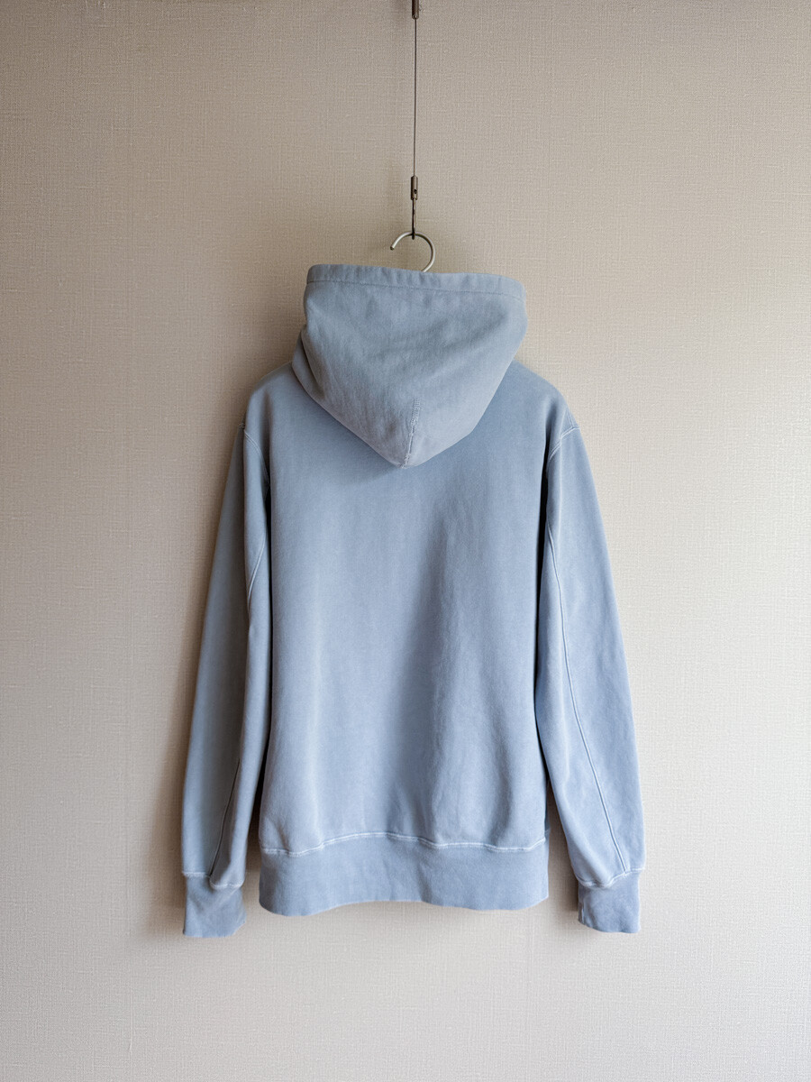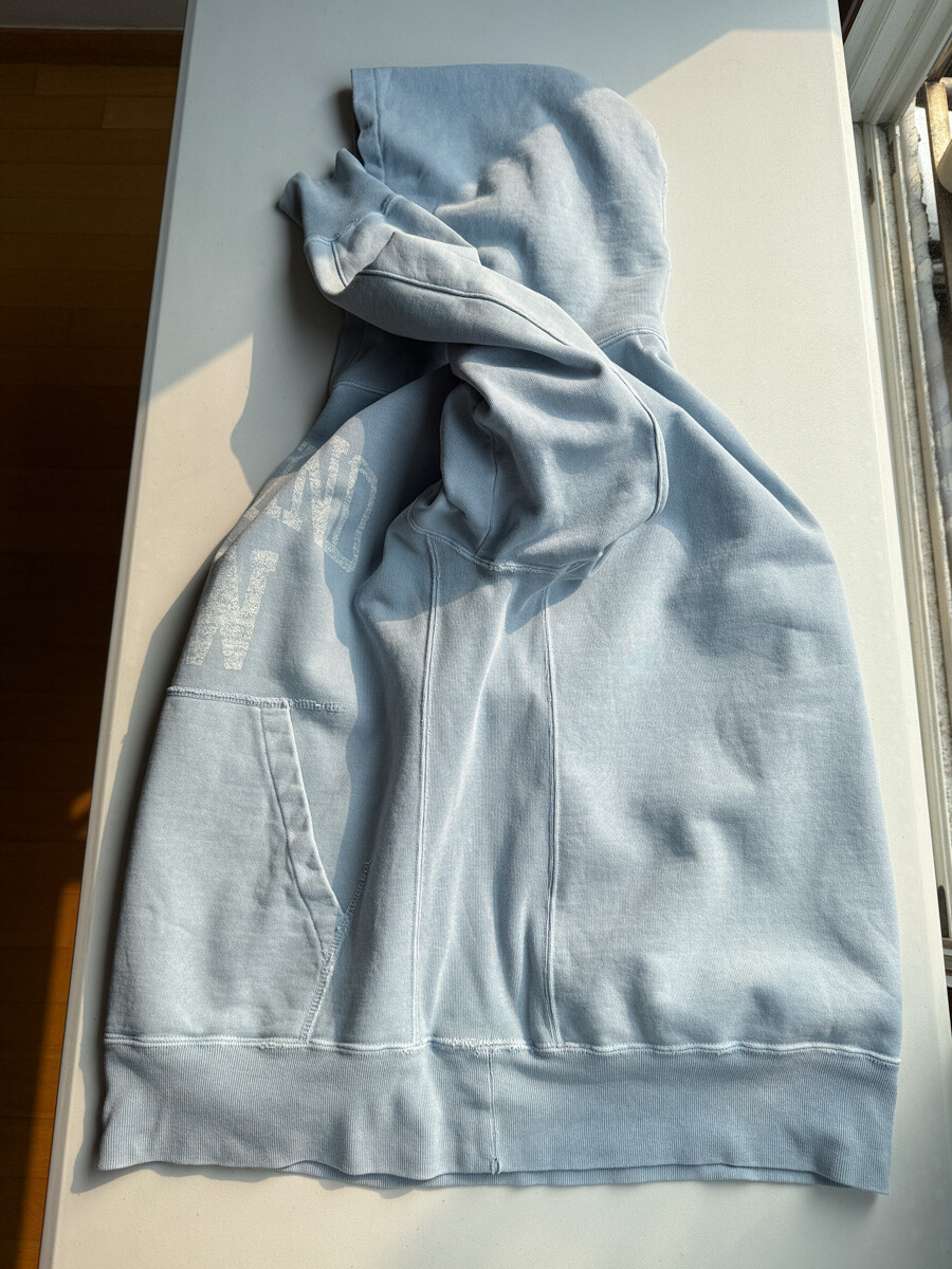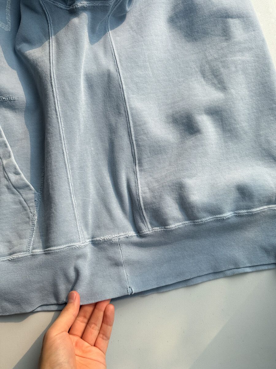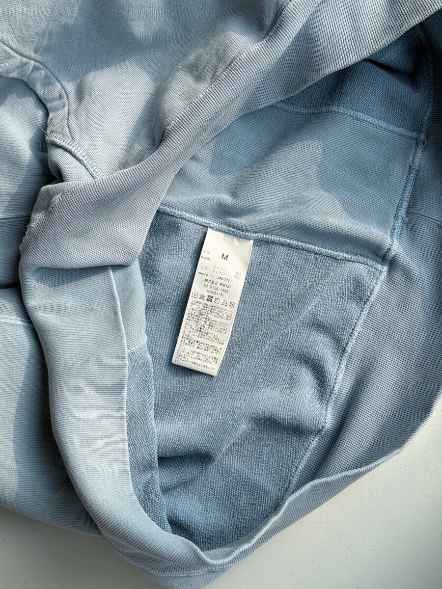 1930년대부터 60년대 후반까지의 스웨트셔츠는 주로 직접 염료와 황화 염료를 사용해 염색했습니다. 헌 옷이 자연스럽게 퇴색되는 원리를 연구해 자연스러운 노화과정을 재현했습니다. 옛날 방식 그대로의 염료를 사용해 산소와 결합시켜, 오랜 시간에 걸쳐 천천히 색이 빠지도록 합니다. 약품이나 바이오 워싱처럼 원단을 억지로 녹이지 않고, 진짜 헌 옷이 오랜 시간에 걸쳐 낡아가는 모습과 가장 유사한 분위기를 구현합니다. 그래서 입으면 입을수록 진짜 빈티지와 거의 구별되지 않을 만큼 자연스럽게 변화하는 옷이 됩니다.