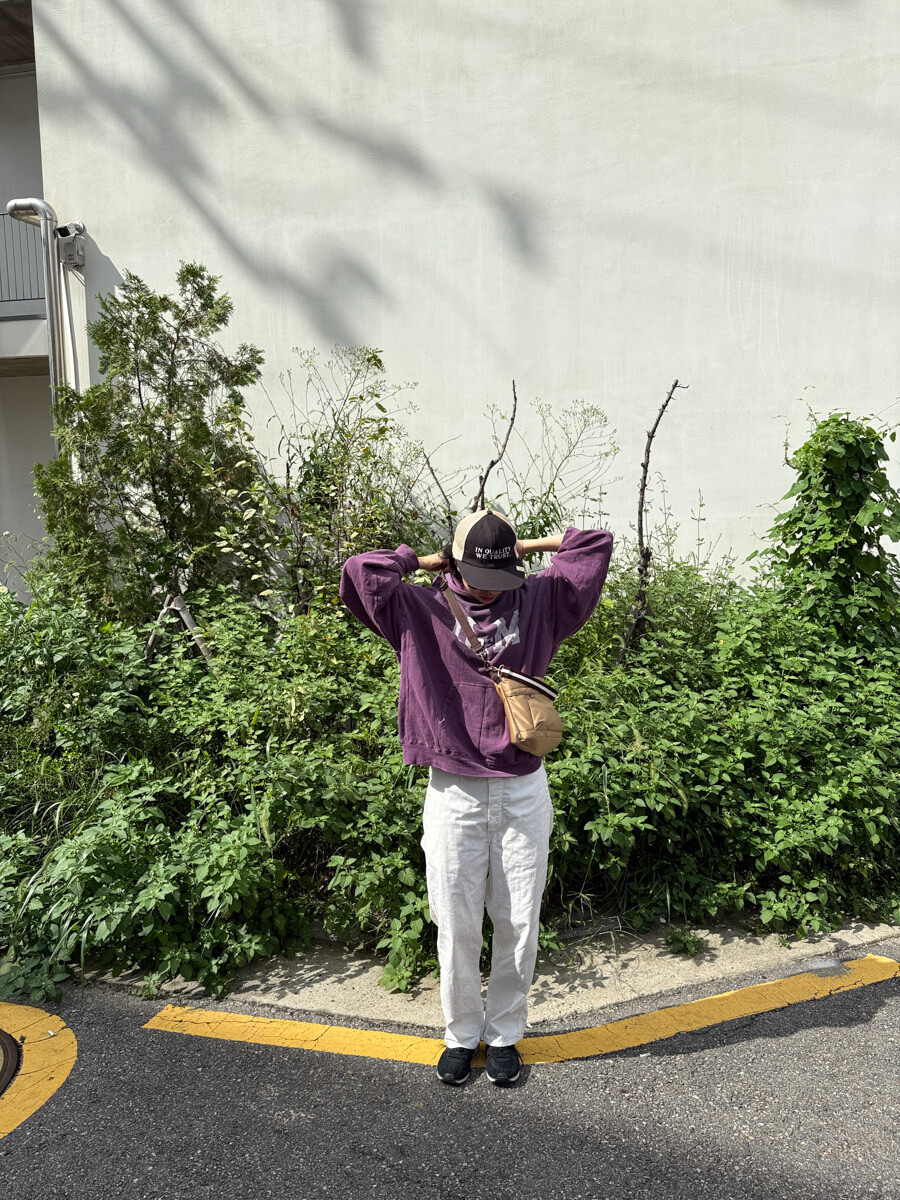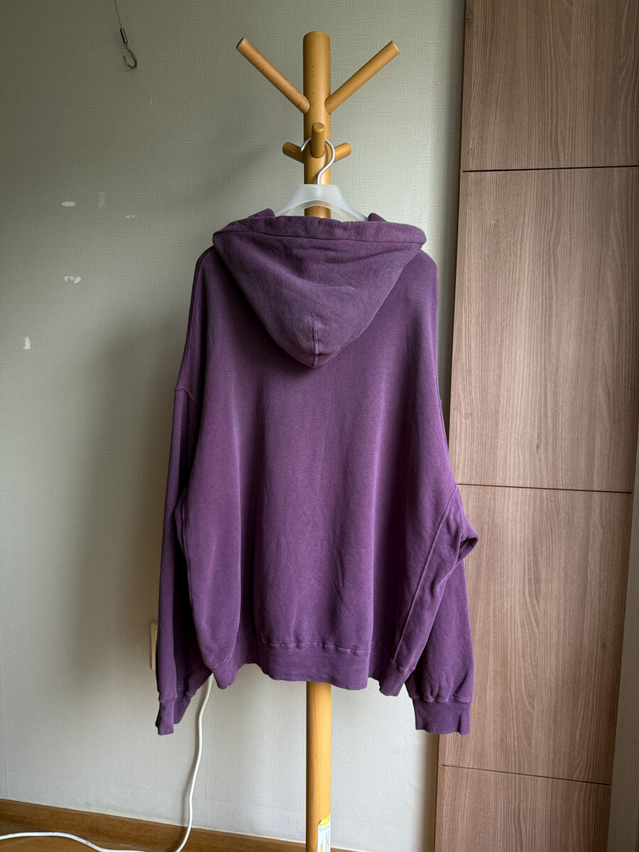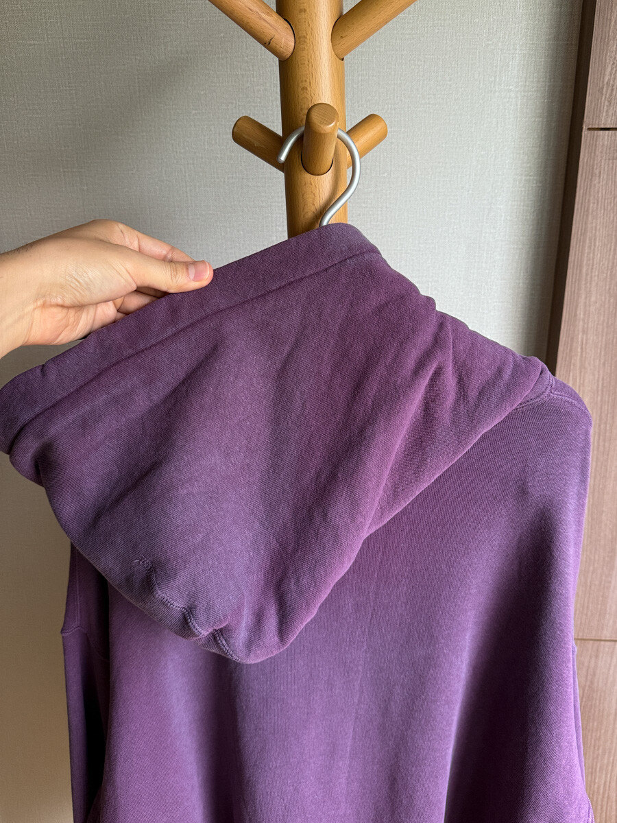 1930년대부터 60년대 후반까지의 스웨트셔츠는 주로 직접 염료와 황화 염료를 사용해 염색했습니다. 헌 옷이 자연스럽게 퇴색되는 원리를 연구해 자연스러운 노화과정을 재현했습니다. 옛날 방식 그대로의 염료를 사용해 산소와 결합시켜, 오랜 시간에 걸쳐 천천히 색이 빠지도록 합니다. 약품이나 바이오 워싱처럼 원단을 억지로 녹이지 않고, 진짜 헌 옷이 오랜 시간에 걸쳐 낡아가는 모습과 가장 유사한 분위기를 구현합니다. 그래서 입으면 입을수록 진짜 빈티지와 거의 구별되지 않을 만큼 자연스럽게 변화하는 옷이 됩니다.