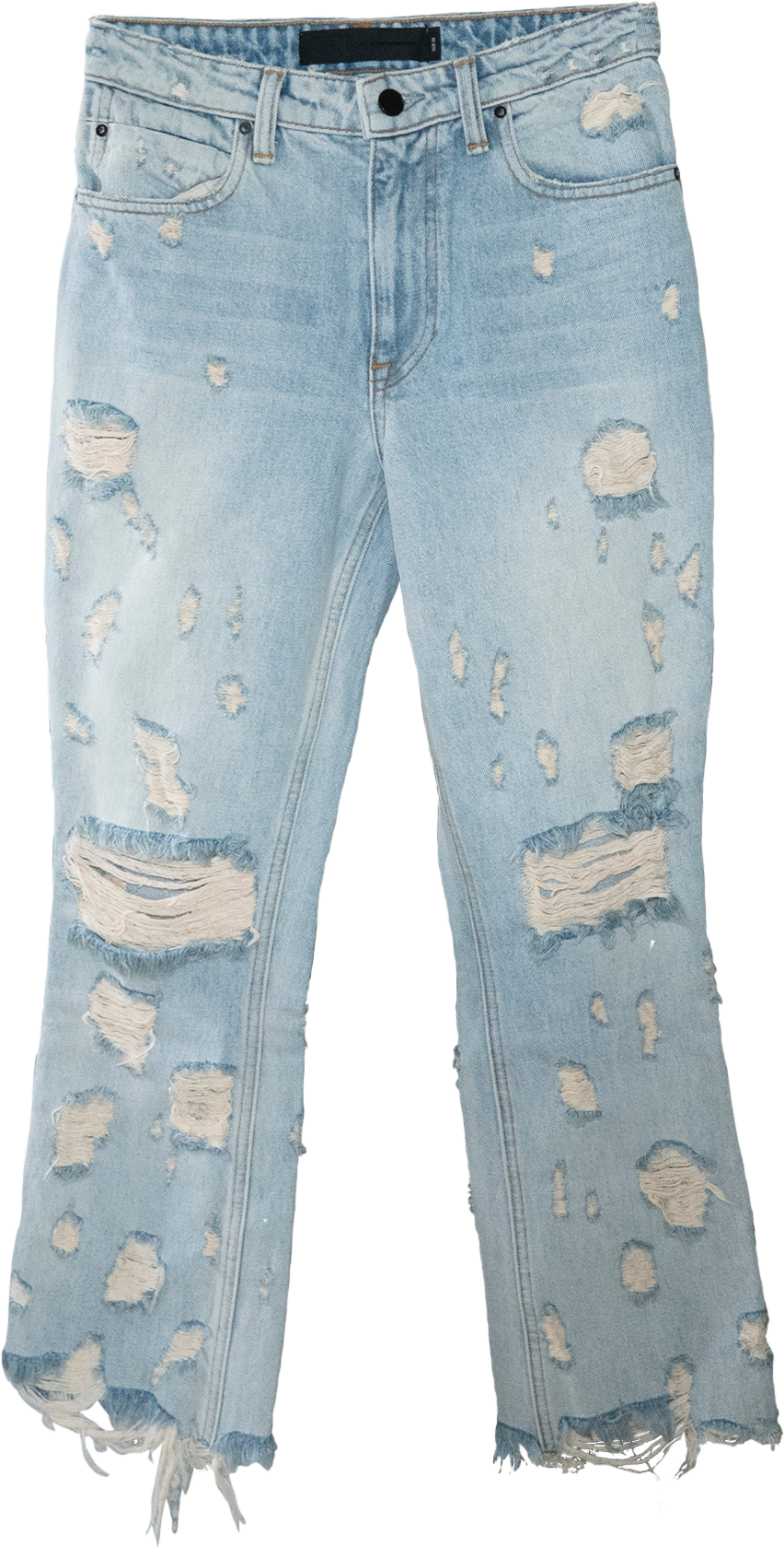 A cropped, high-waisted jean in bleach indigo denim, cut with a flared leg and heavily distressed throughout.