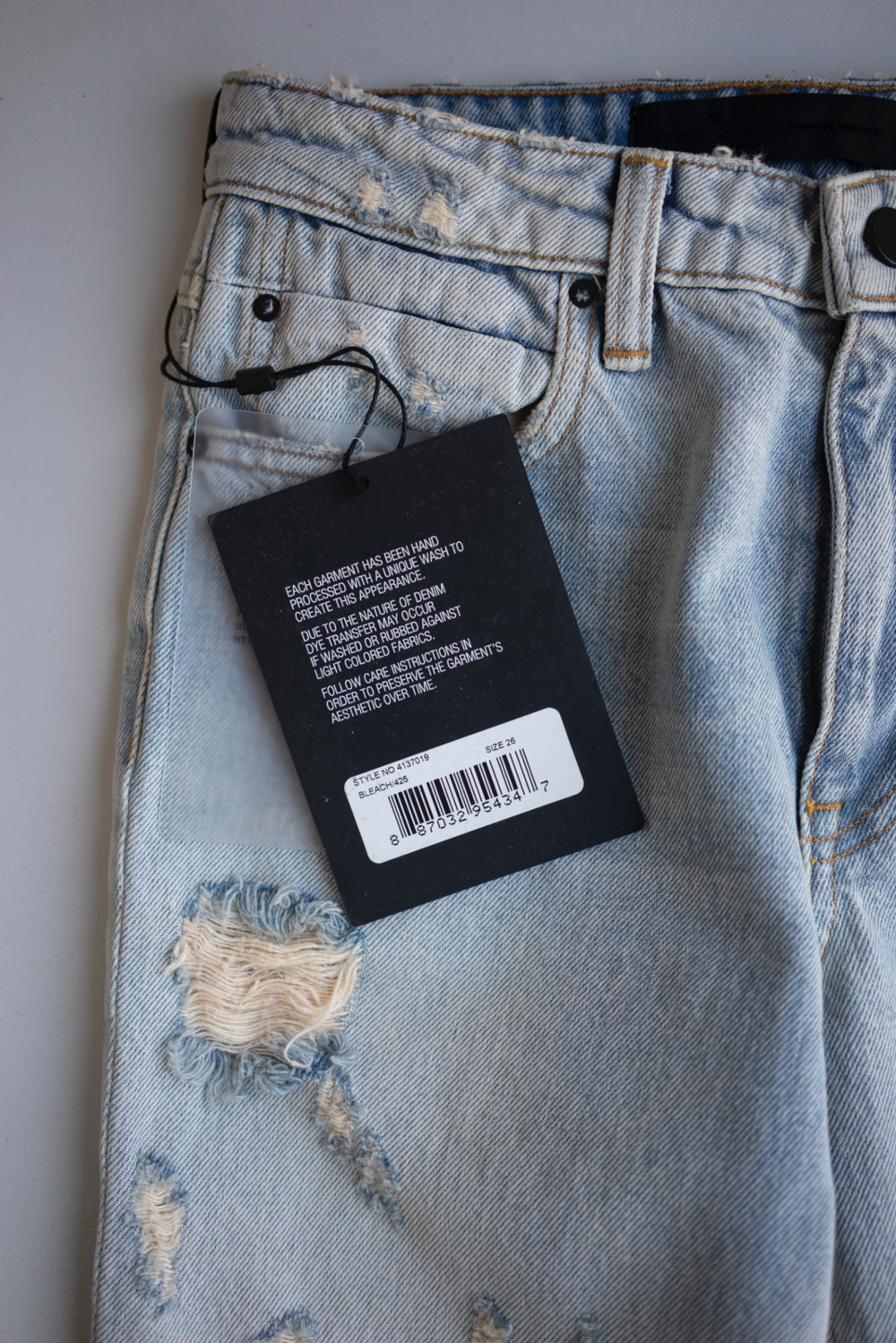- Zip fly with matte black button closure