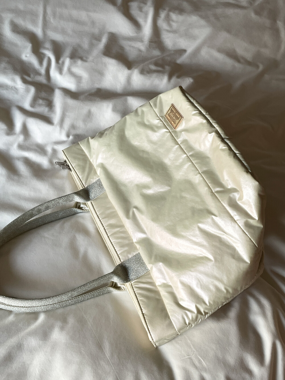 나일론 원단에 투명 폴리우레탄 코팅, 또한 블루와 레드의 광채 펄 가공을 이중으로 실시, 다시 폴리우레탄 코팅했습니다.