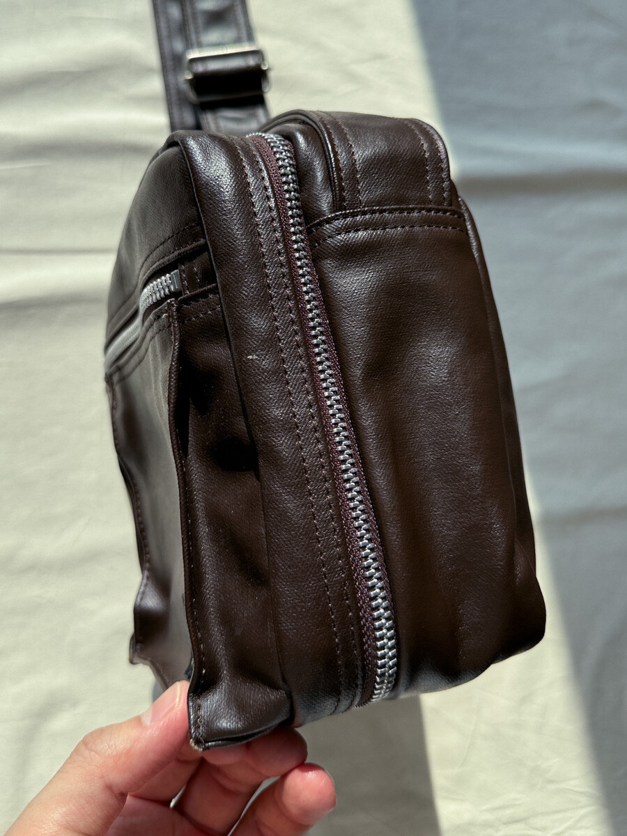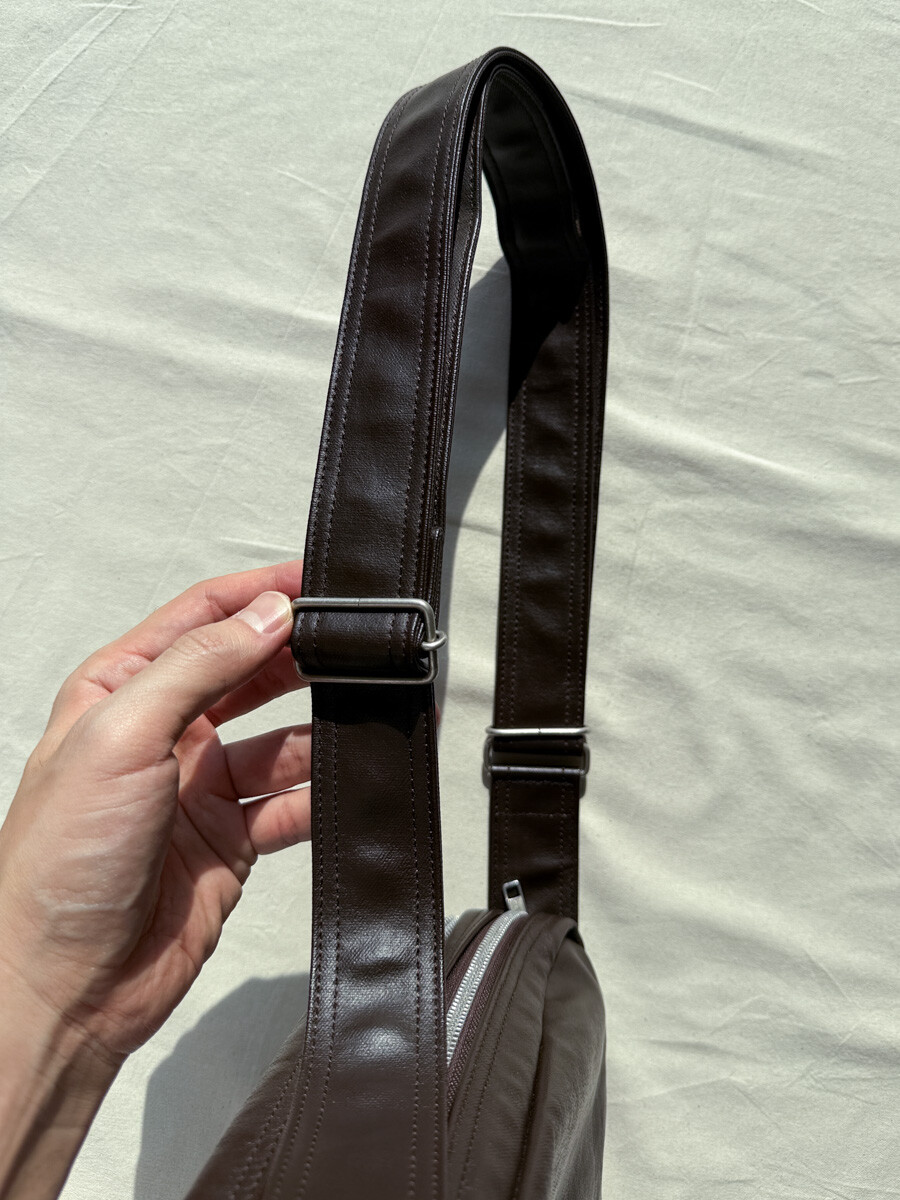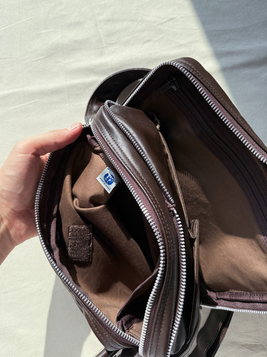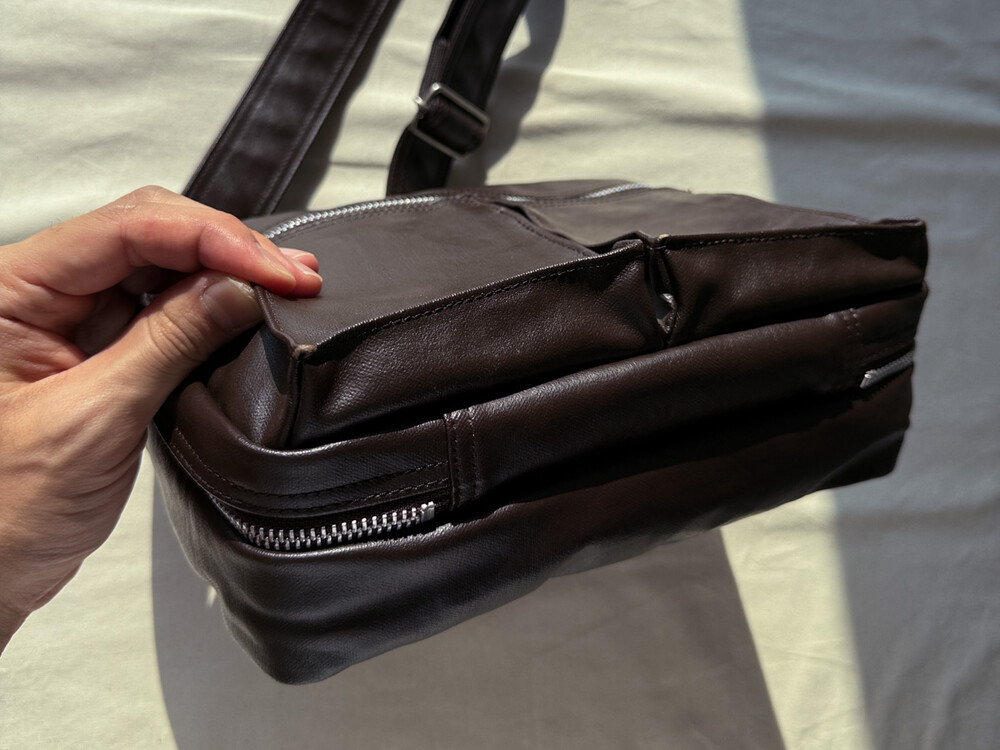 후염색을 통해 원단을 수축시켜 독특한 질감을 표현했으며, 제품으로 만든 후에는 가방을 문질러 적당한 구김을 주기 위해 마무리했습니다. 일반 원단과 다르게 생겼고 가죽처럼 보이는 독특한 질감의 원단입니다.