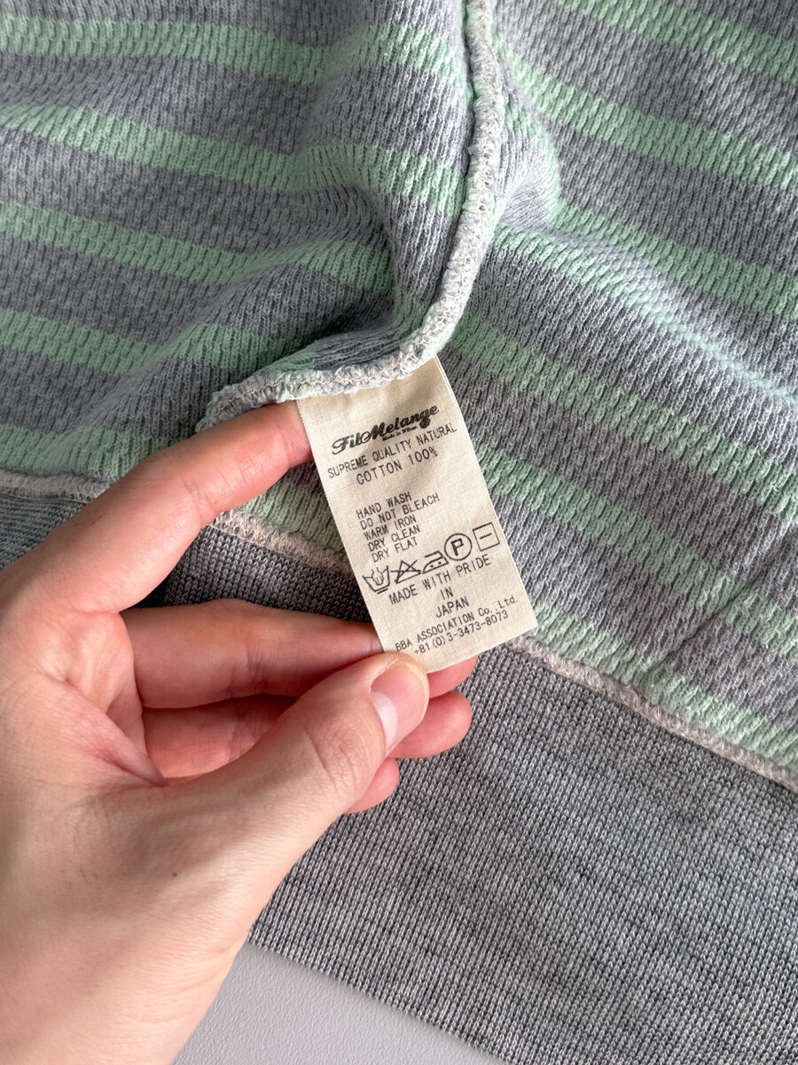 필 멜란지는 '실이라는 뜻의 Fil' 과 '멜란지스러운 색상의 melange' 라는 단어가 합쳐서 만들어진 브랜드입니다. 브랜드의 이름만큼 실제로도 다른 두가지색상의 실을 섞어 특유의 색상을 만들어 내는 것이 특징입니다. 색상 뿐만 아니라 다른 원단의 실을 꼬아서 독특한 텍스쳐의 소재를 만들어 사용하기도 합니다. 원료가 되는 목화면부터 실과 원단 봉제까지 모두 자사공장의 mad in JAPAN 을 고집 합니다. 또한 환경에 해를 끼치지 않는 천연 원료의 고품질을 목표로 하는 점 또한 친환경적인 브랜드로써 시사하는 바가 큽니다.