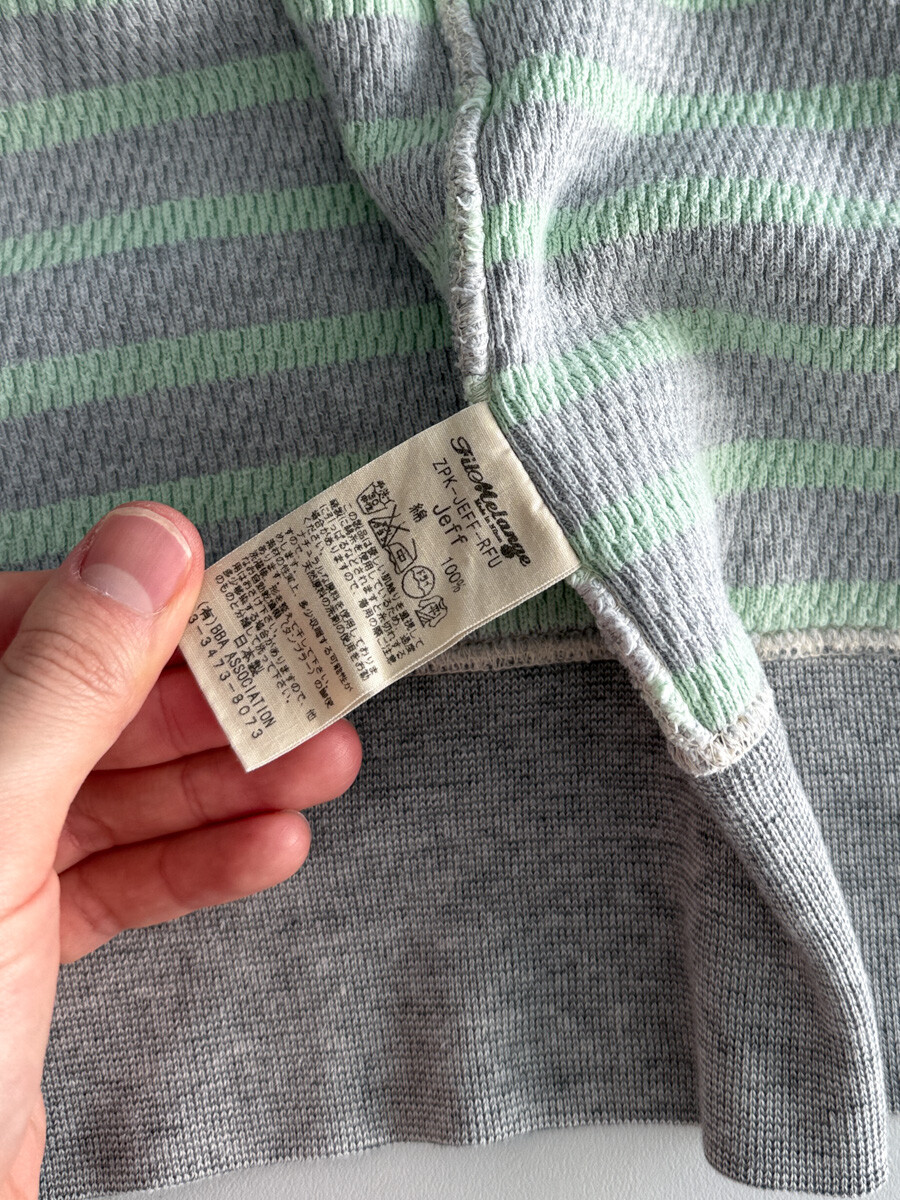 1950년대부터 고즈넉하게 남아있는 '매다는 뜨개질기'로 원단을 생산하고 있어 실에 부담을 주지 않고 중력에 의해 떨어지는 힘만으로 짜여나가기 때문에 '공기를 함께 엮고 있는' 것처럼 통통하고 부드러운 탄력이 있는 원단이 가능합니다. 세탁 등으로 인한 모양새가 쉽게 흐트러지지 않으며 원단의 탄력도 잃지 않습니다.