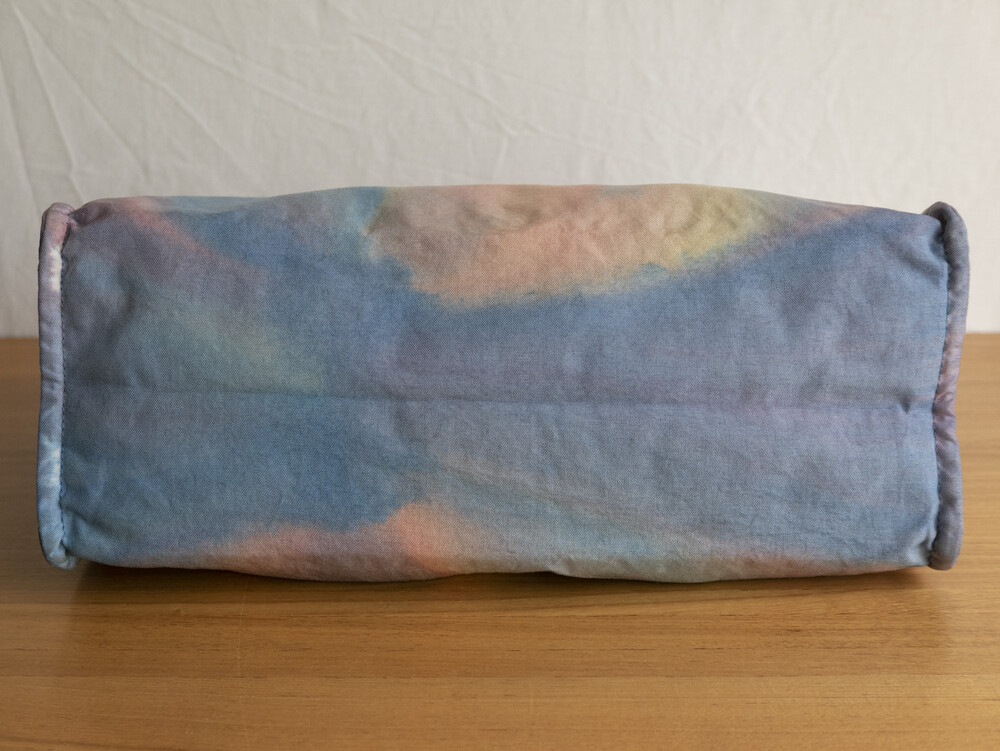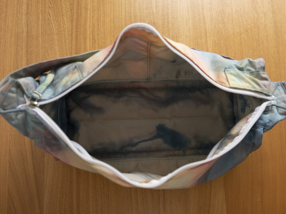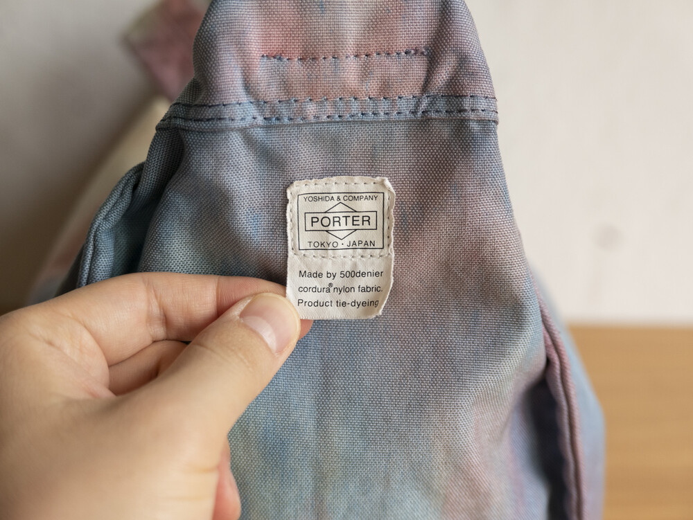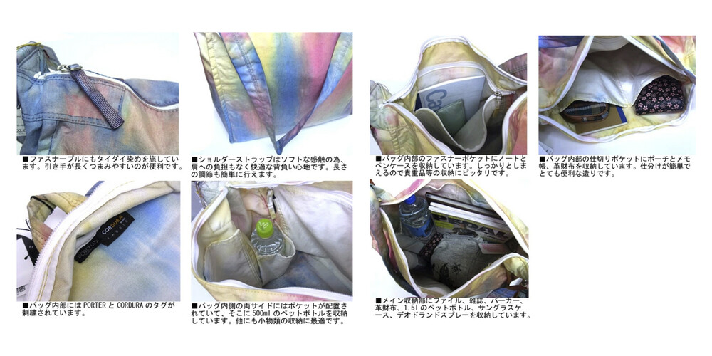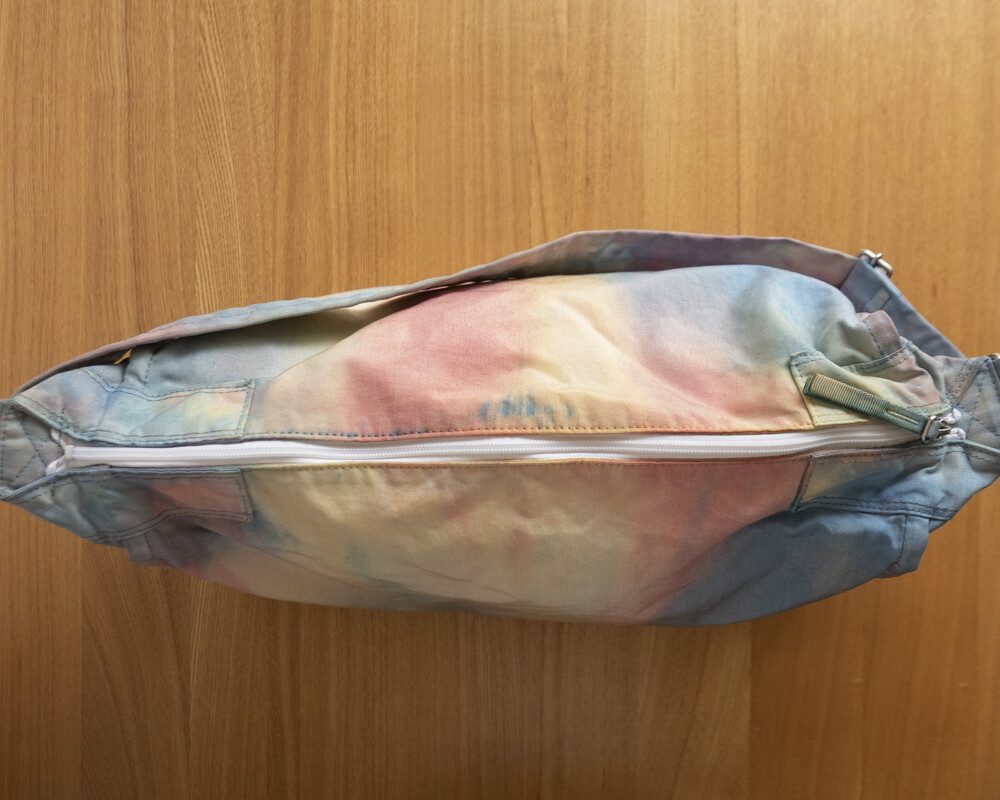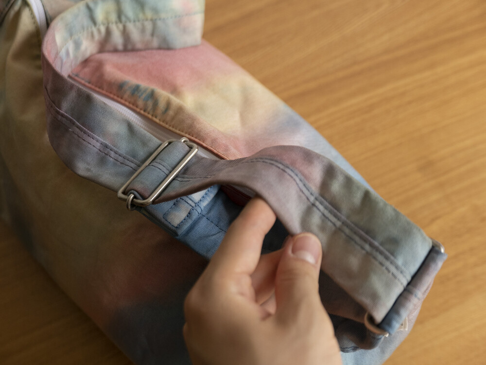 일반적으로 면이나 마 등의 천연 소재에 이용하는 염색 방법의 타이다이 가공을 코듀라 나일론에 실시하고 있는 것이 가장 큰 특징입니다.타이다이 가공을 봉제 후 마지막 부품마다 구분 없이 가방 전체로 연결되어 보이도록 했습니다. 또한 아웃포켓이 없는 플랫한 표면으로 만들어 타이다이의 무늬를 강조시키는 디자인을 하였습니다.