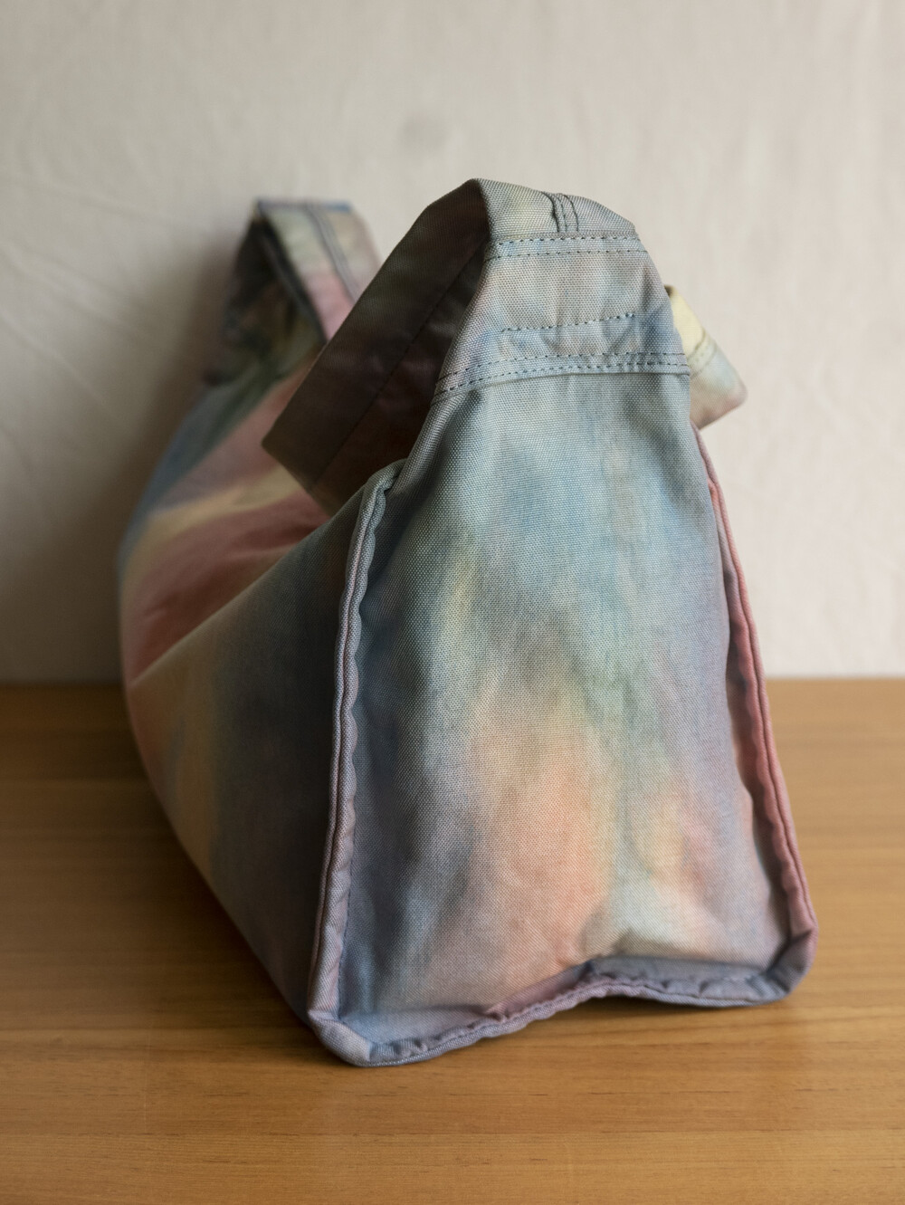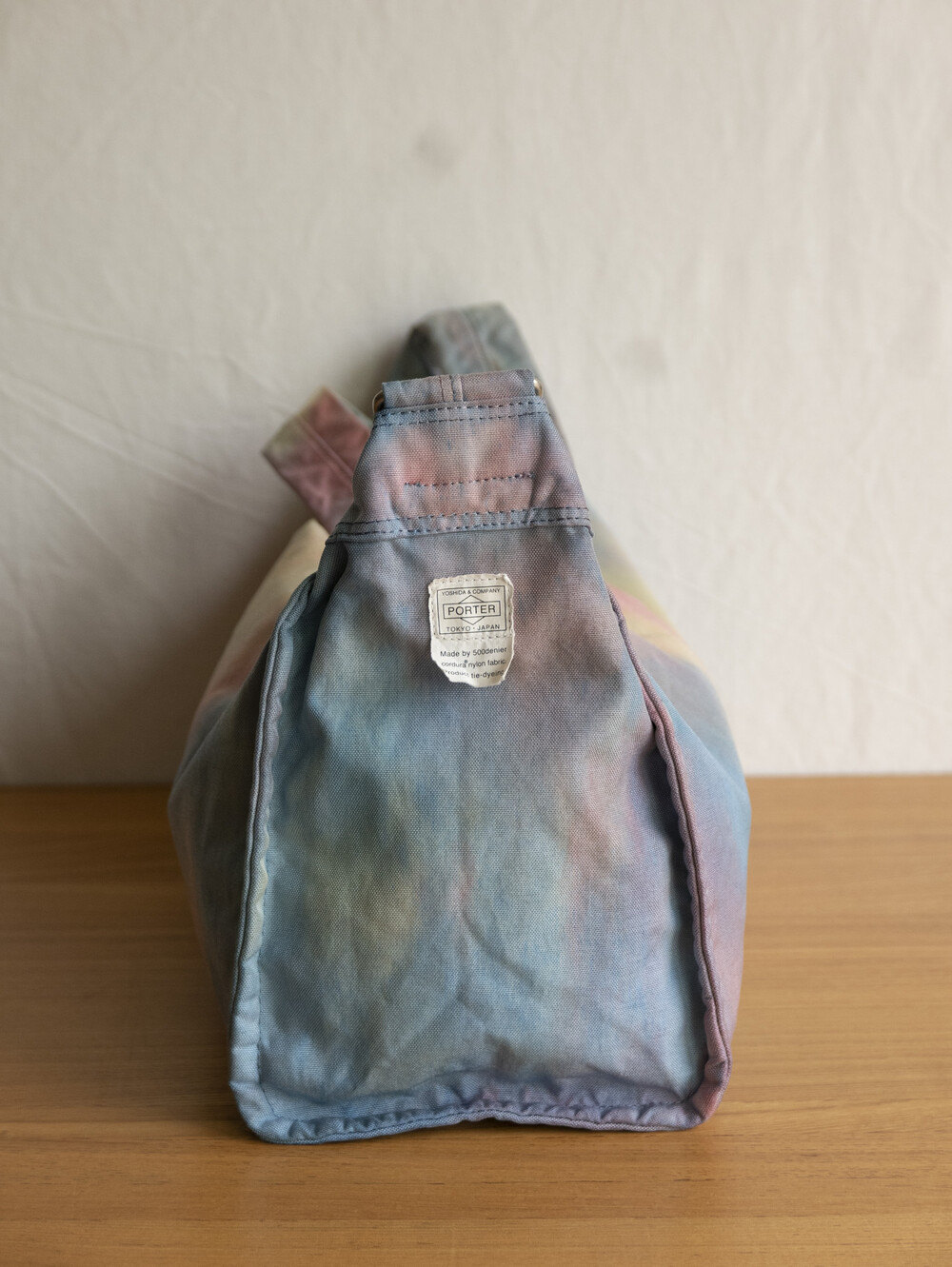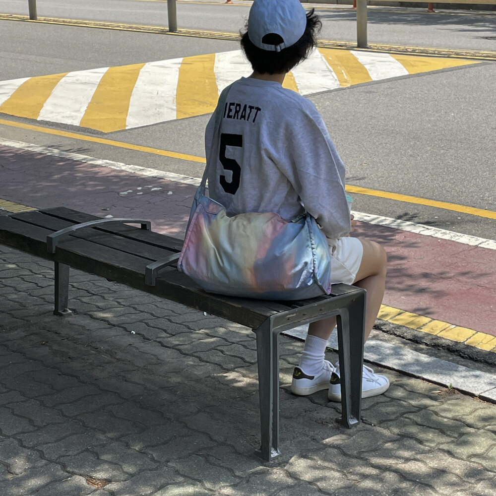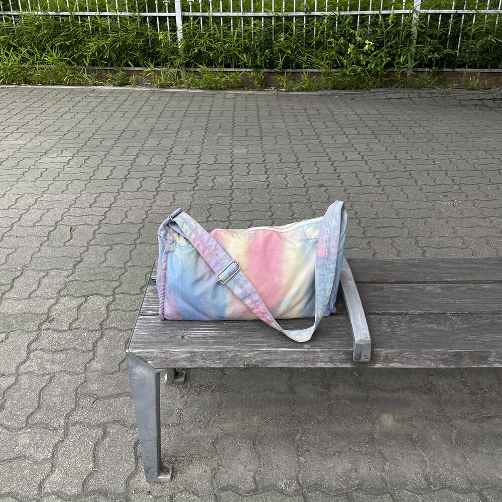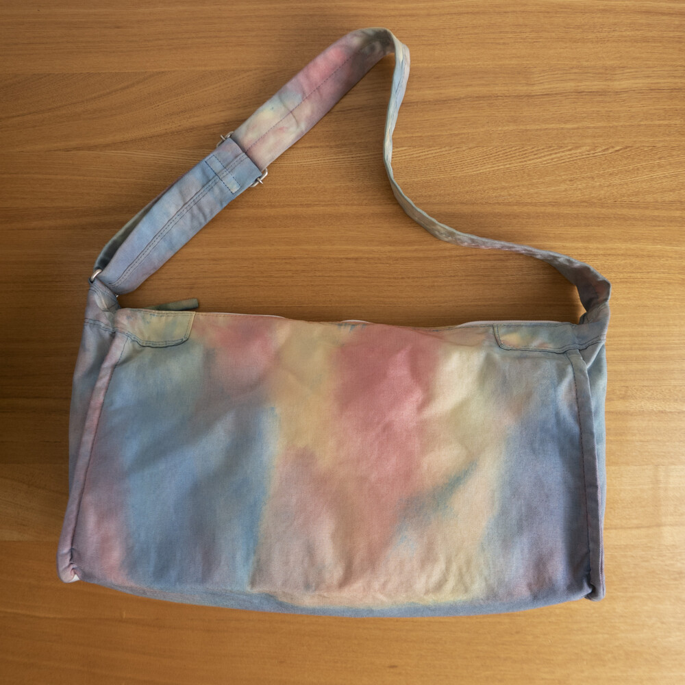 일반적으로 면이나 마 등의 천연 소재에 이용하는 염색 방법의 타이다이 가공을 코듀라 나일론에 실시하고 있는 것이 가장 큰 특징입니다.타이다이 가공을 봉제 후 마지막 부품마다 구분 없이 가방 전체로 연결되어 보이도록 했습니다. 또한 아웃포켓이 없는 플랫한 표면으로 만들어 타이다이의 무늬를 강조시키는 디자인을 하였습니다.