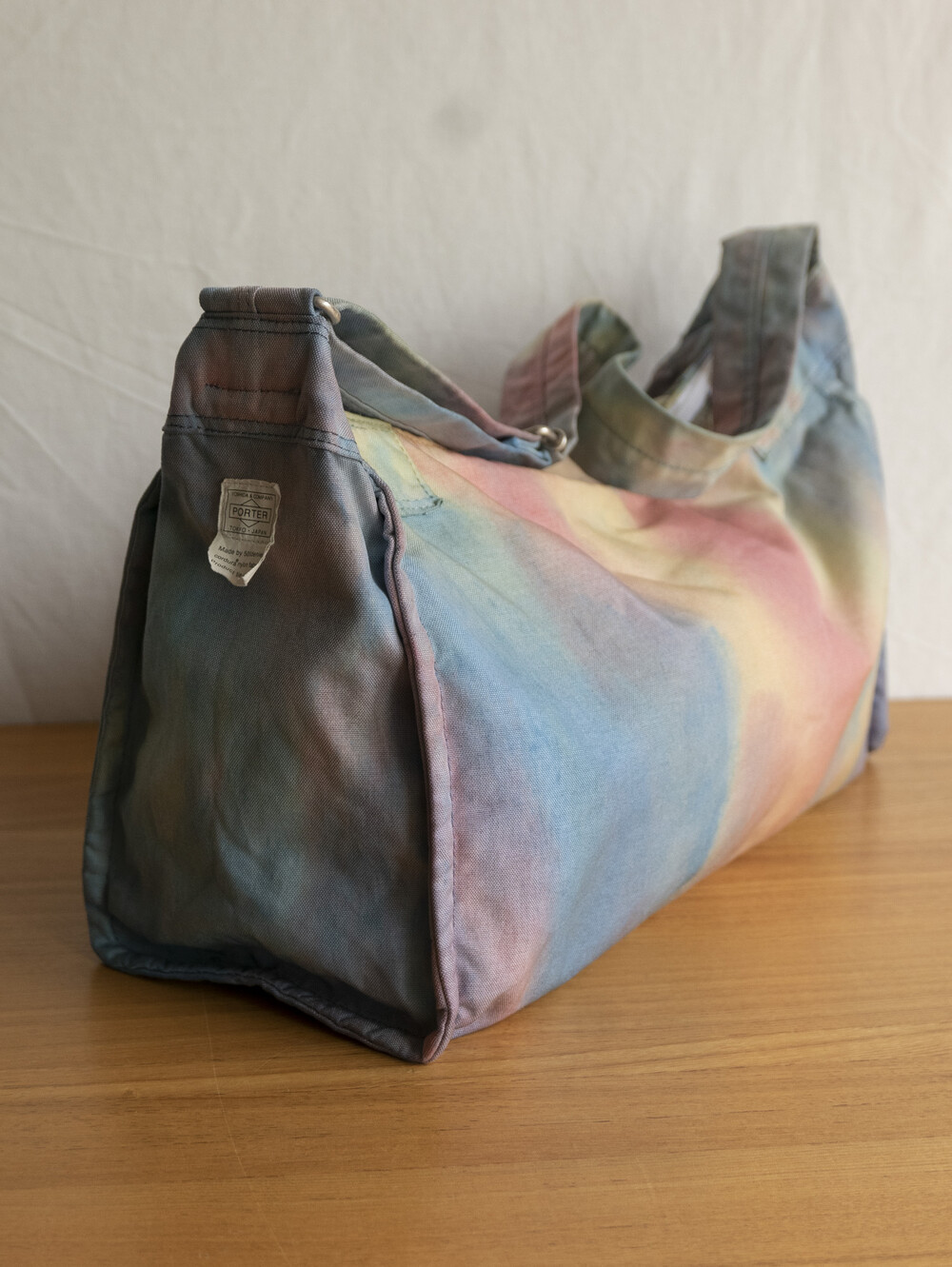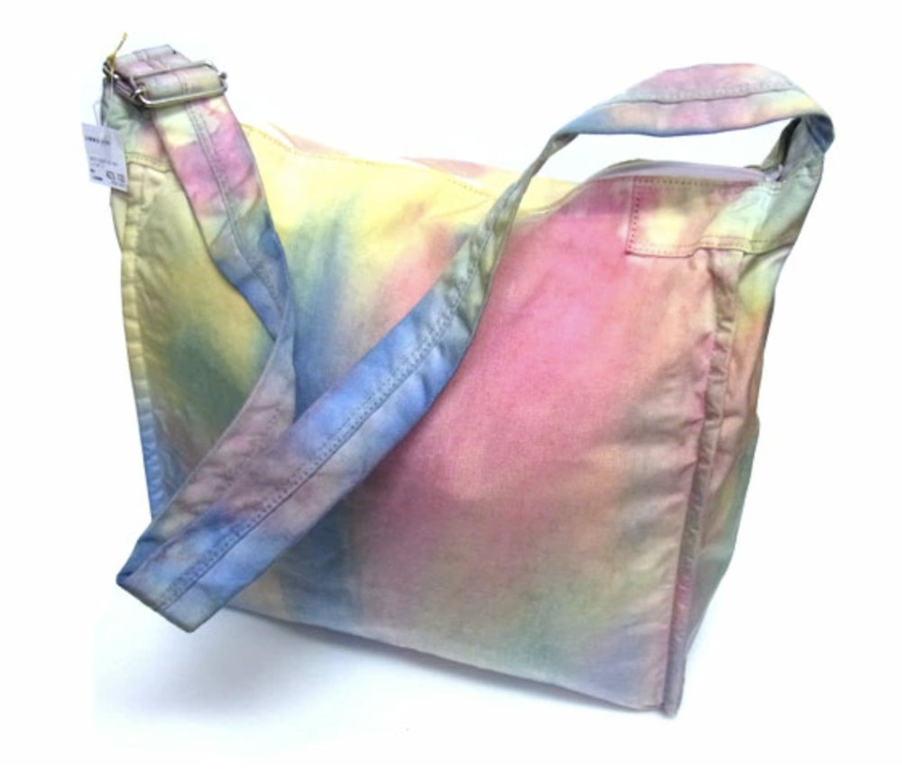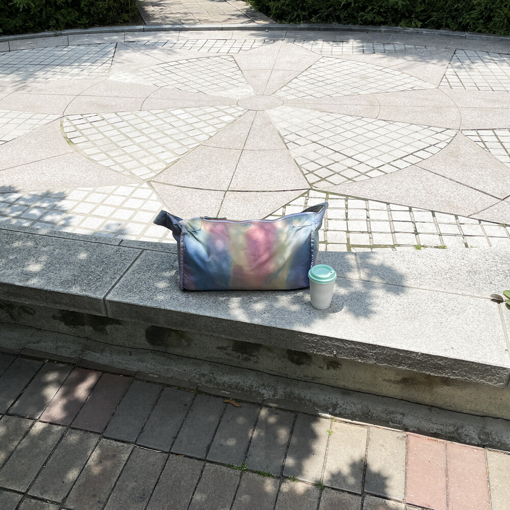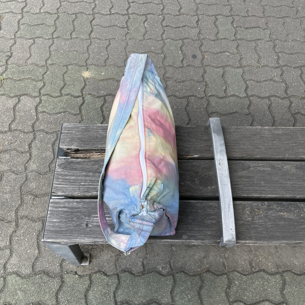 일반적으로 면이나 마 등의 천연 소재에 이용하는 염색 방법의 타이다이 가공을 코듀라 나일론에 실시하고 있는 것이 가장 큰 특징입니다.타이다이 가공을 봉제 후 마지막 부품마다 구분 없이 가방 전체로 연결되어 보이도록 했습니다. 또한 아웃포켓이 없는 플랫한 표면으로 만들어 타이다이의 무늬를 강조시키는 디자인을 하였습니다.
