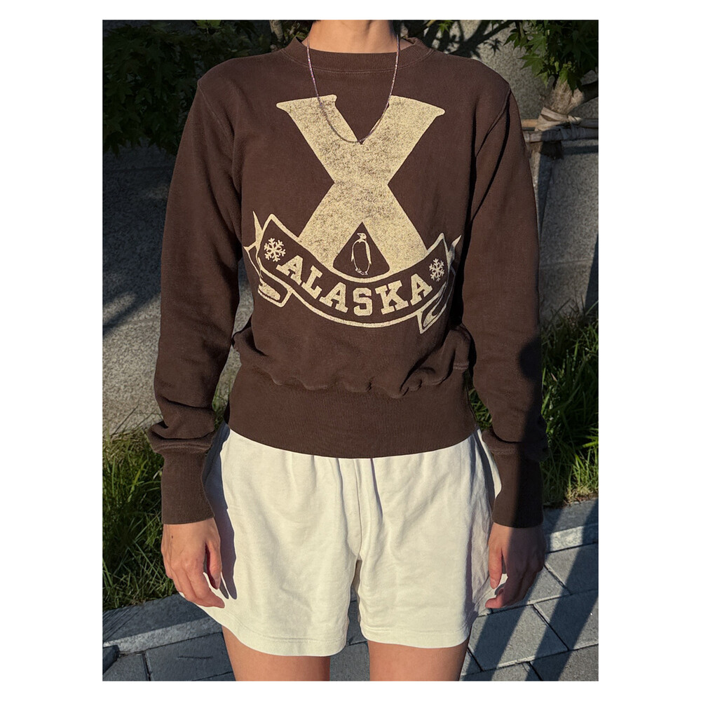 짙은 초콜릿 브라운 컬러 바탕에 크로스된 도끼와 펭귄, ALASKA 레터링이 큼직하게 프린트되어 빈티지 아웃도어 무드를 강하게 풍깁니다. 세월이 흐른 듯한 프린트의 크랙감이 오히려 매력적으로, 자연스러운 경년 변화를 즐기실 수 있습니다.