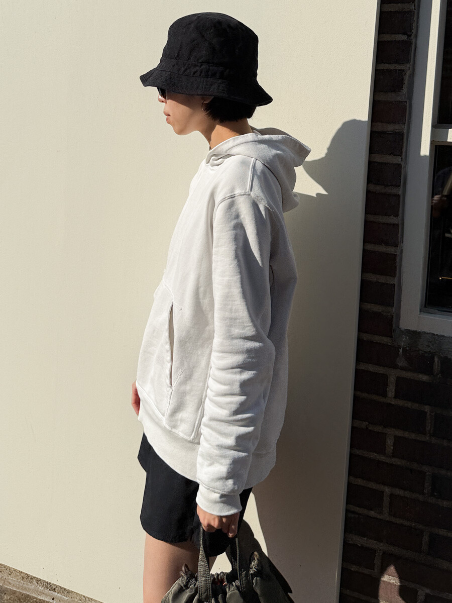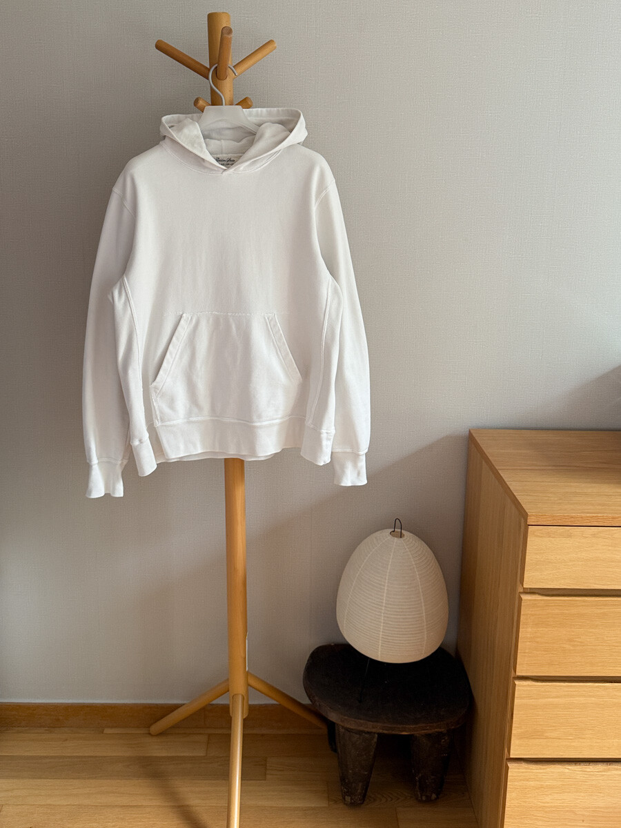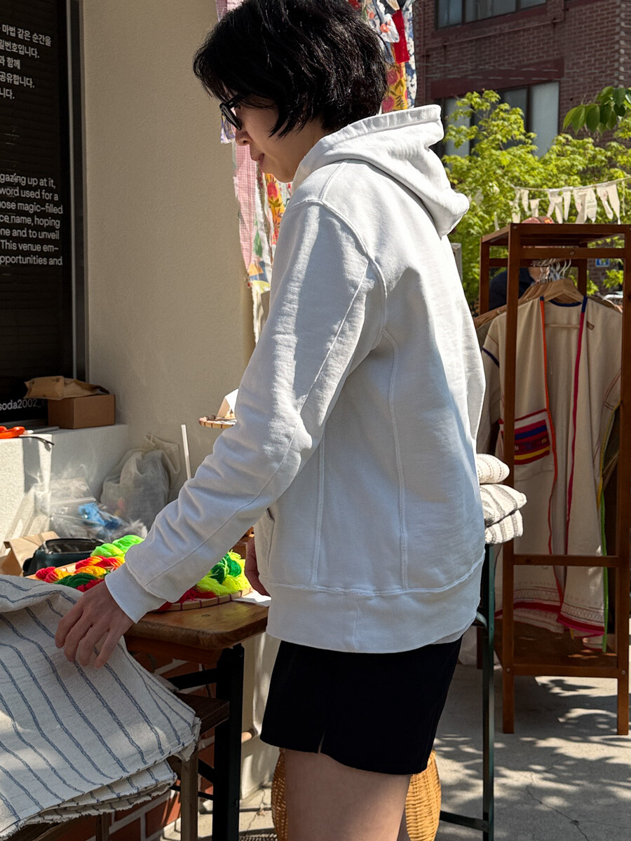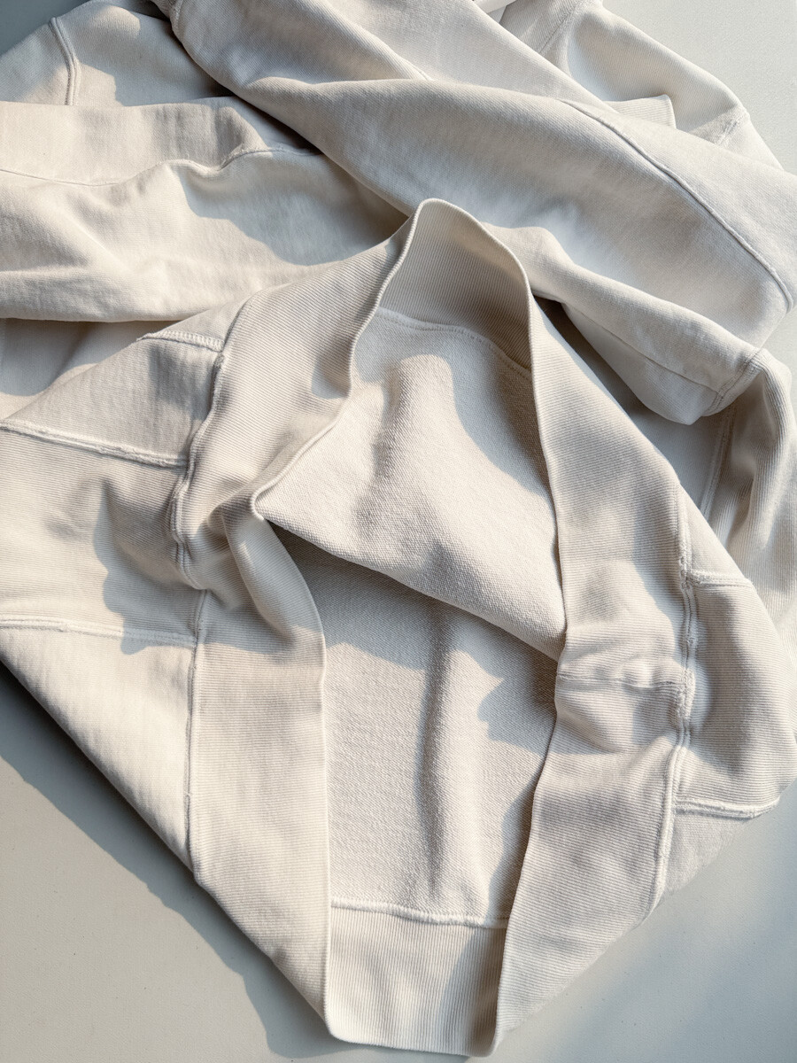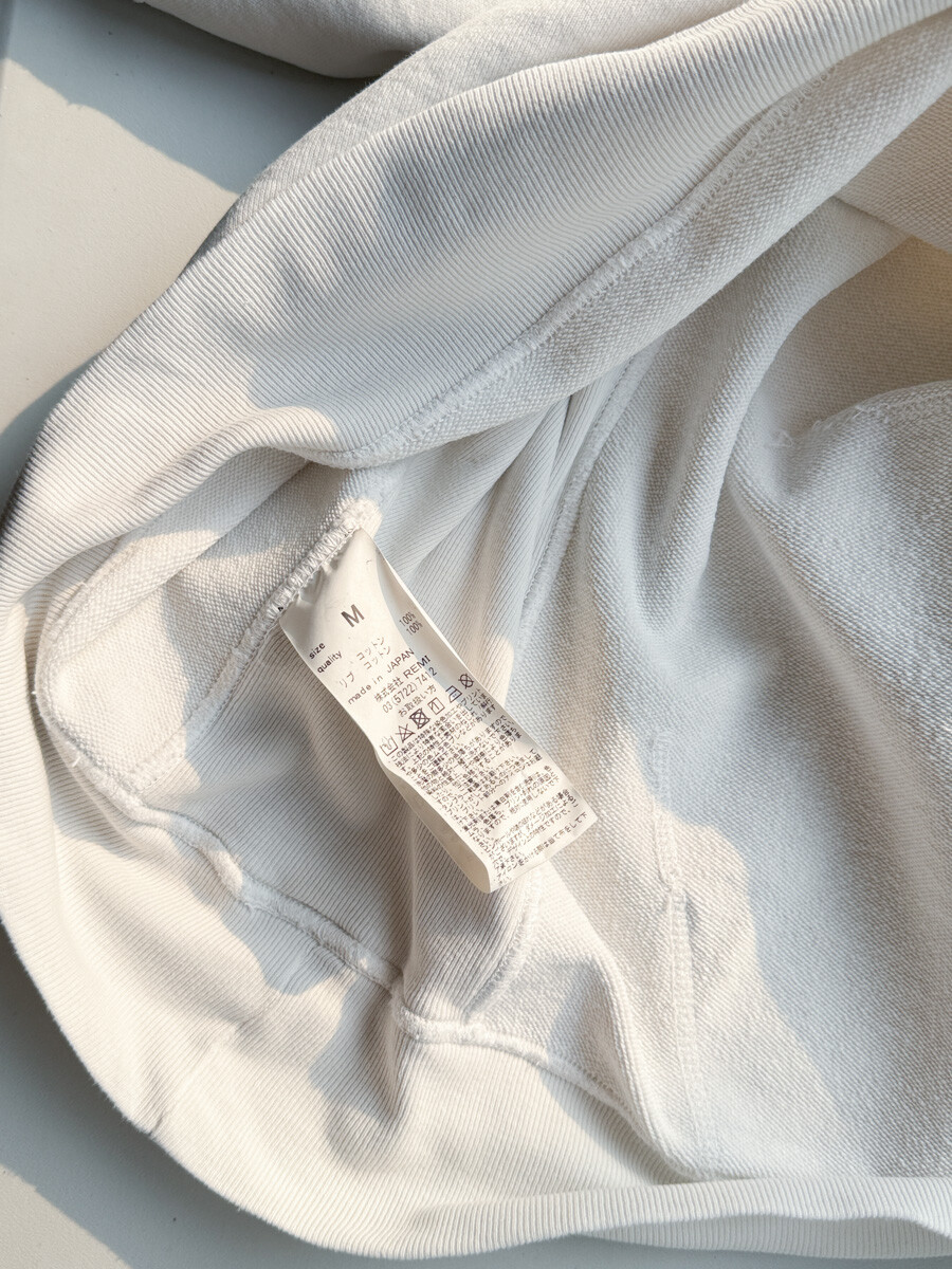 1930년대부터 60년대 후반까지의 스웨트셔츠는 주로 직접 염료와 황화 염료를 사용해 염색했습니다. 헌 옷이 자연스럽게 퇴색되는 원리를 연구해 자연스러운 노화과정을 재현했습니다. 옛날 방식 그대로의 염료를 사용해 산소와 결합시켜, 오랜 시간에 걸쳐 천천히 색이 빠지도록 합니다. 약품이나 바이오 워싱처럼 원단을 억지로 녹이지 않고, 진짜 헌 옷이 오랜 시간에 걸쳐 낡아가는 모습과 가장 유사한 분위기를 구현합니다. 그래서 입으면 입을수록 진짜 빈티지와 거의 구별되지 않을 만큼 자연스럽게 변화하는 옷이 됩니다.