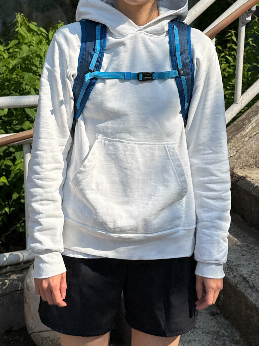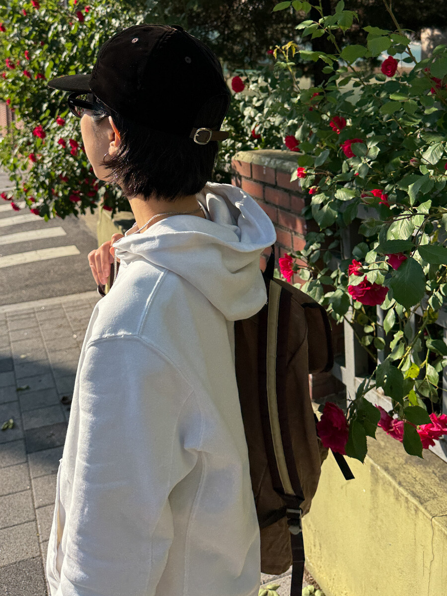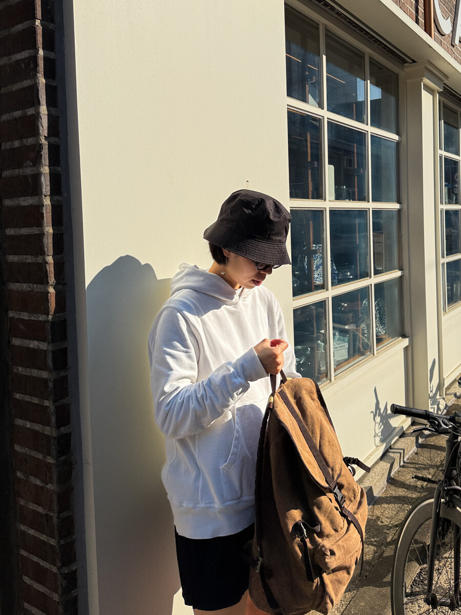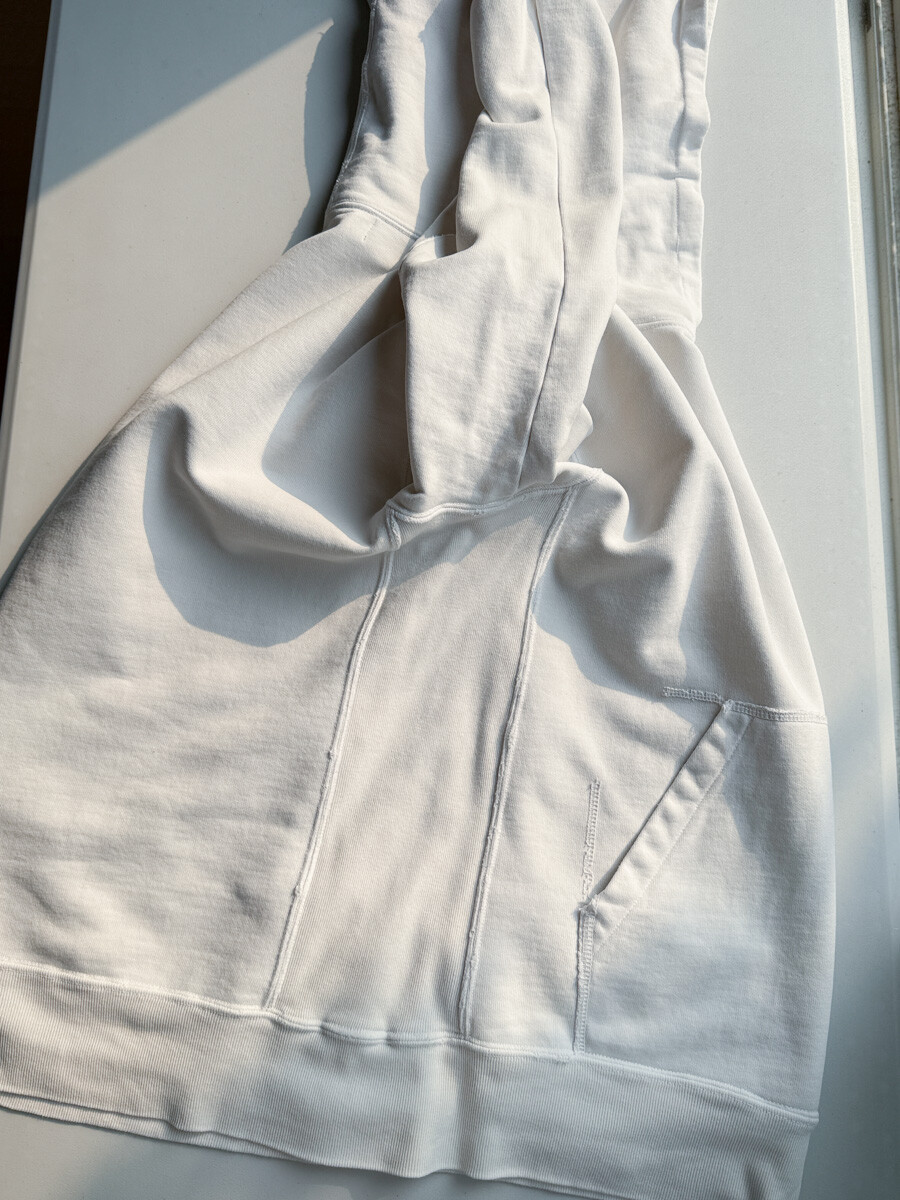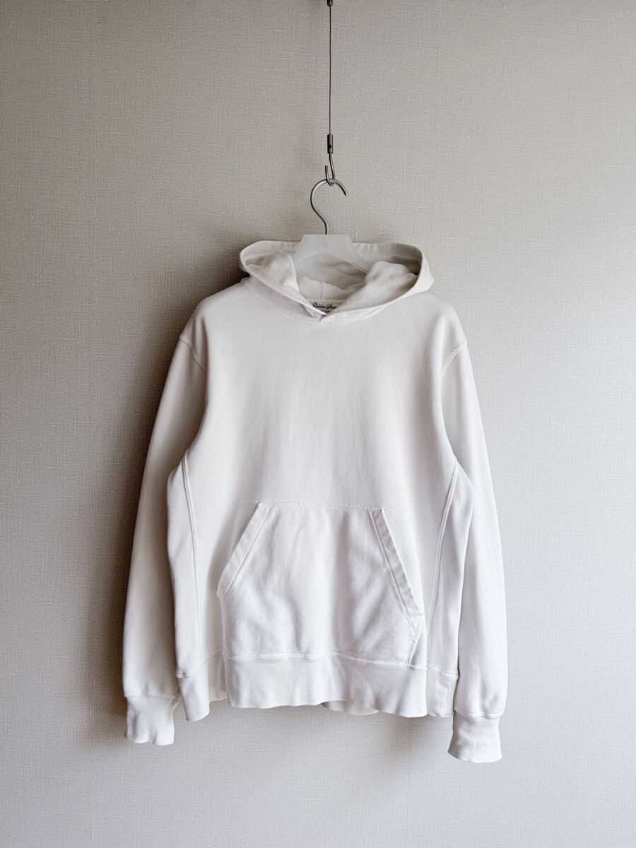 1930년대부터 60년대 후반까지의 스웨트셔츠는 주로 직접 염료와 황화 염료를 사용해 염색했습니다. 헌 옷이 자연스럽게 퇴색되는 원리를 연구해 자연스러운 노화과정을 재현했습니다. 옛날 방식 그대로의 염료를 사용해 산소와 결합시켜, 오랜 시간에 걸쳐 천천히 색이 빠지도록 합니다. 약품이나 바이오 워싱처럼 원단을 억지로 녹이지 않고, 진짜 헌 옷이 오랜 시간에 걸쳐 낡아가는 모습과 가장 유사한 분위기를 구현합니다. 그래서 입으면 입을수록 진짜 빈티지와 거의 구별되지 않을 만큼 자연스럽게 변화하는 옷이 됩니다.