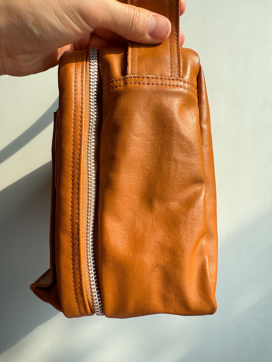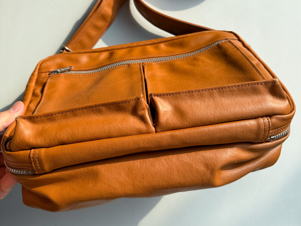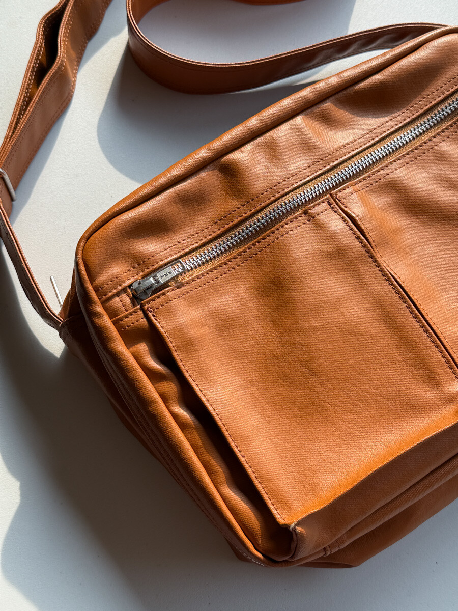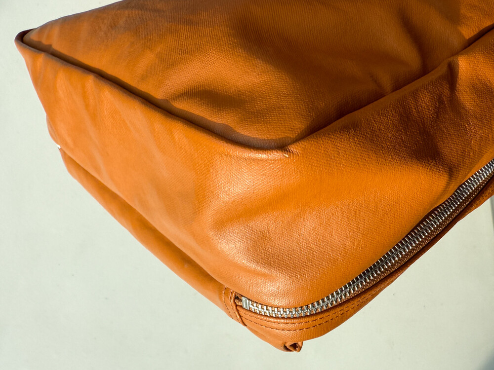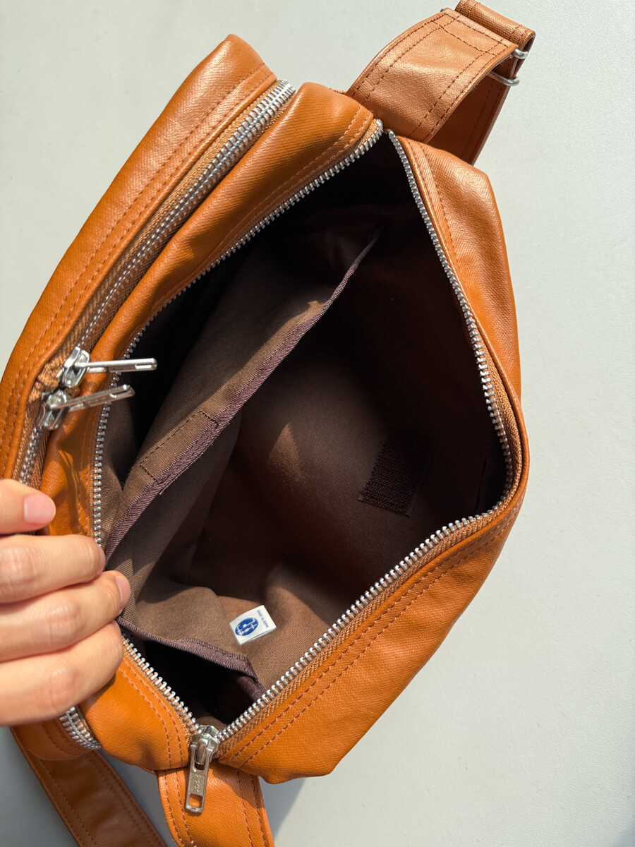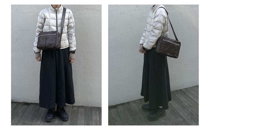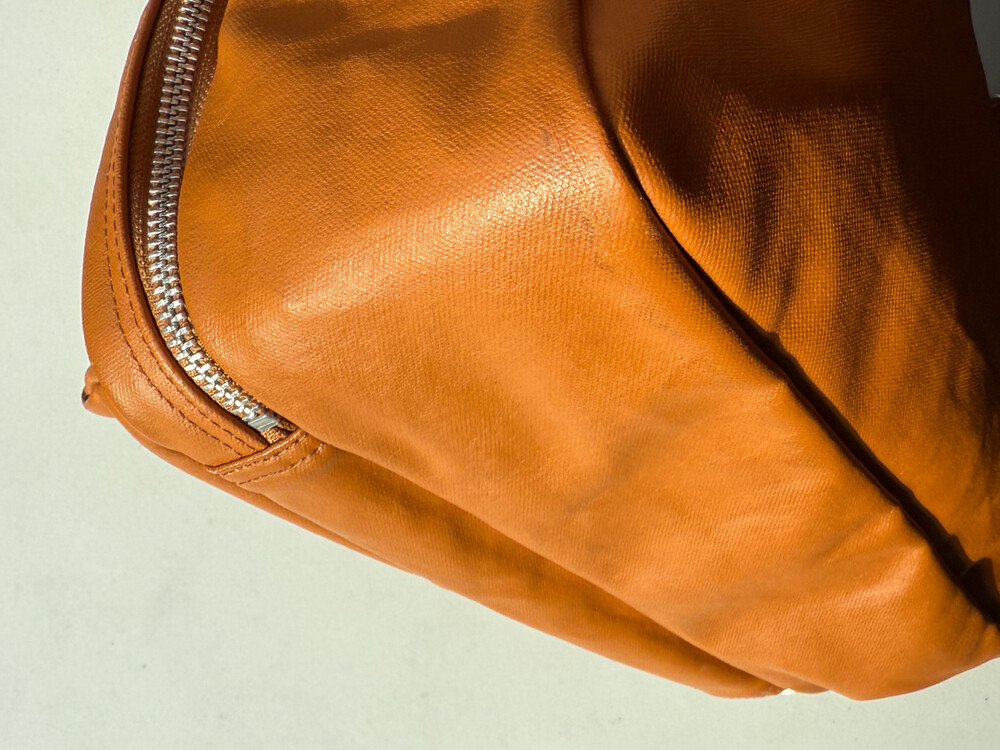 후염색을 통해 원단을 수축시켜 독특한 질감을 표현했으며, 제품으로 만든 후에는 가방을 문질러 적당한 구김을 주기 위해 마무리했습니다. 일반 원단과 다르게 생겼고 가죽처럼 보이는 독특한 질감의 원단입니다.