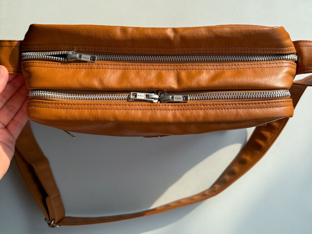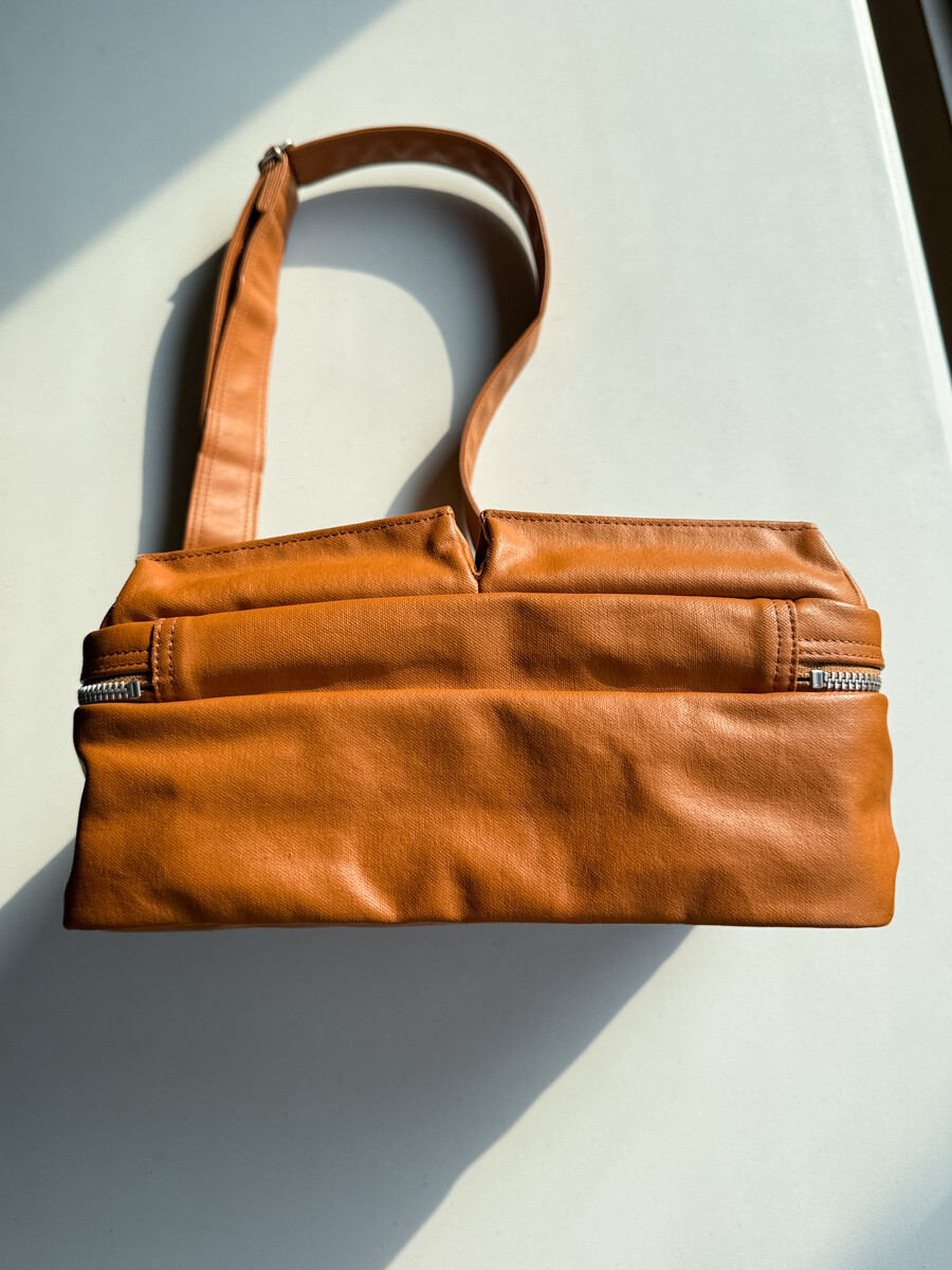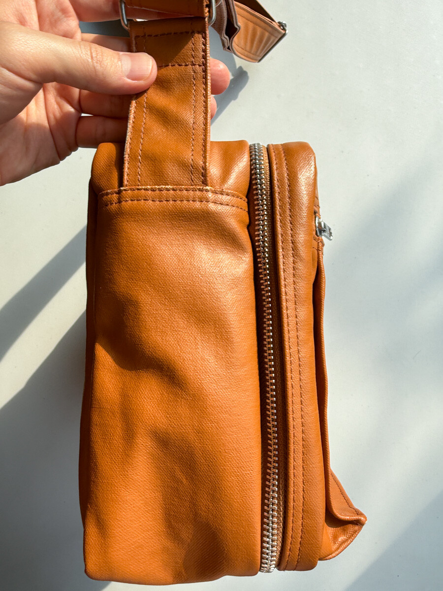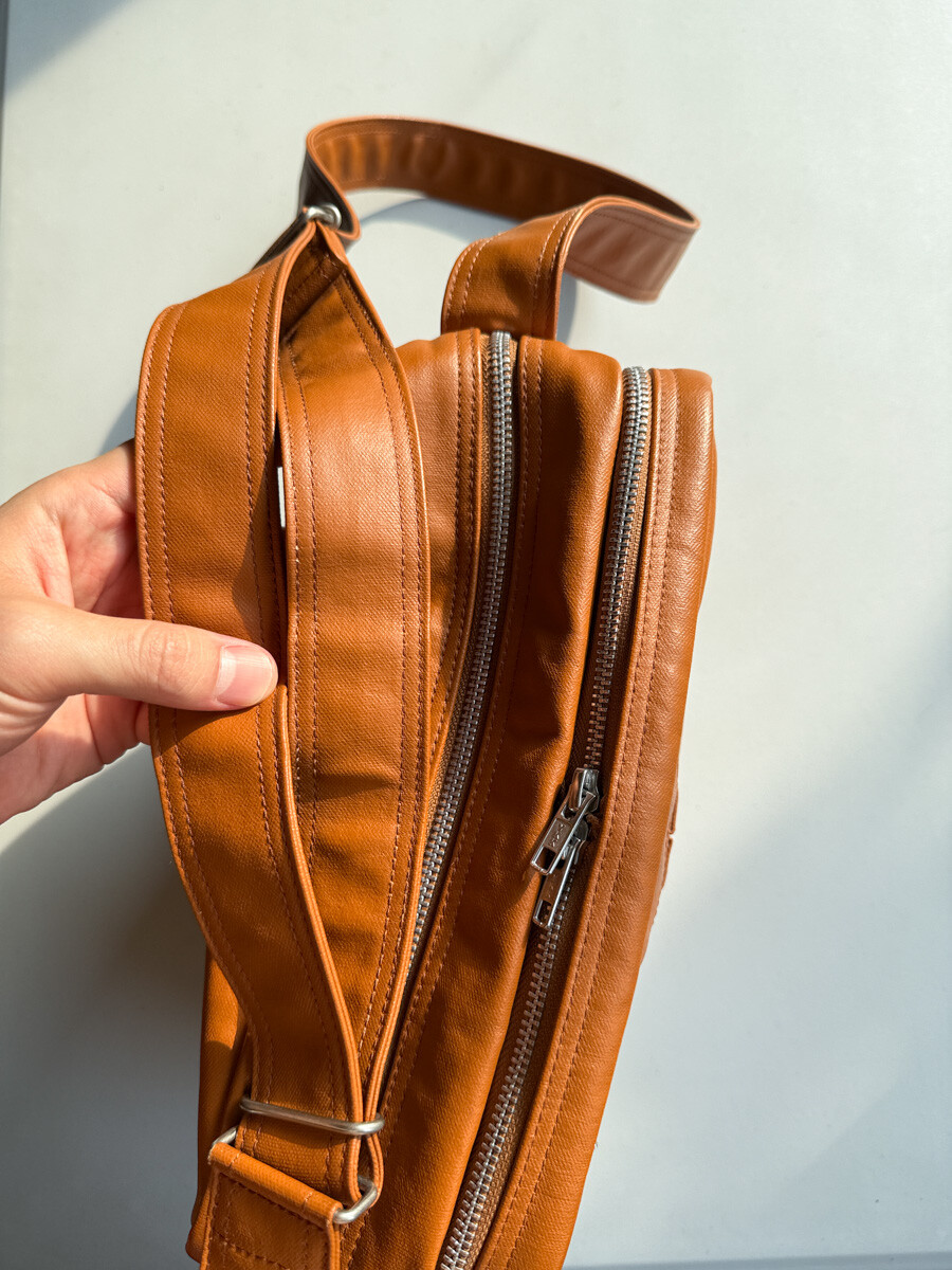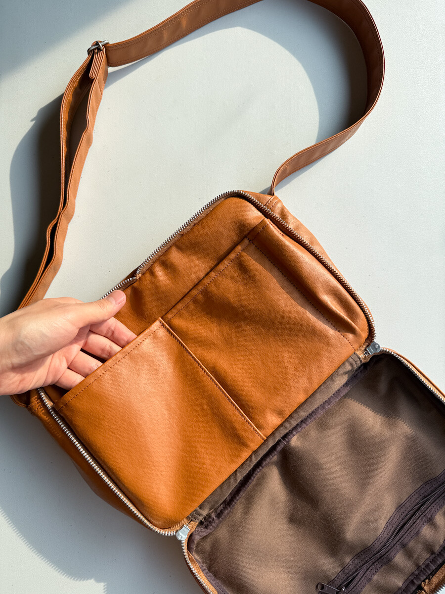 후염색을 통해 원단을 수축시켜 독특한 질감을 표현했으며, 제품으로 만든 후에는 가방을 문질러 적당한 구김을 주기 위해 마무리했습니다. 일반 원단과 다르게 생겼고 가죽처럼 보이는 독특한 질감의 원단입니다.