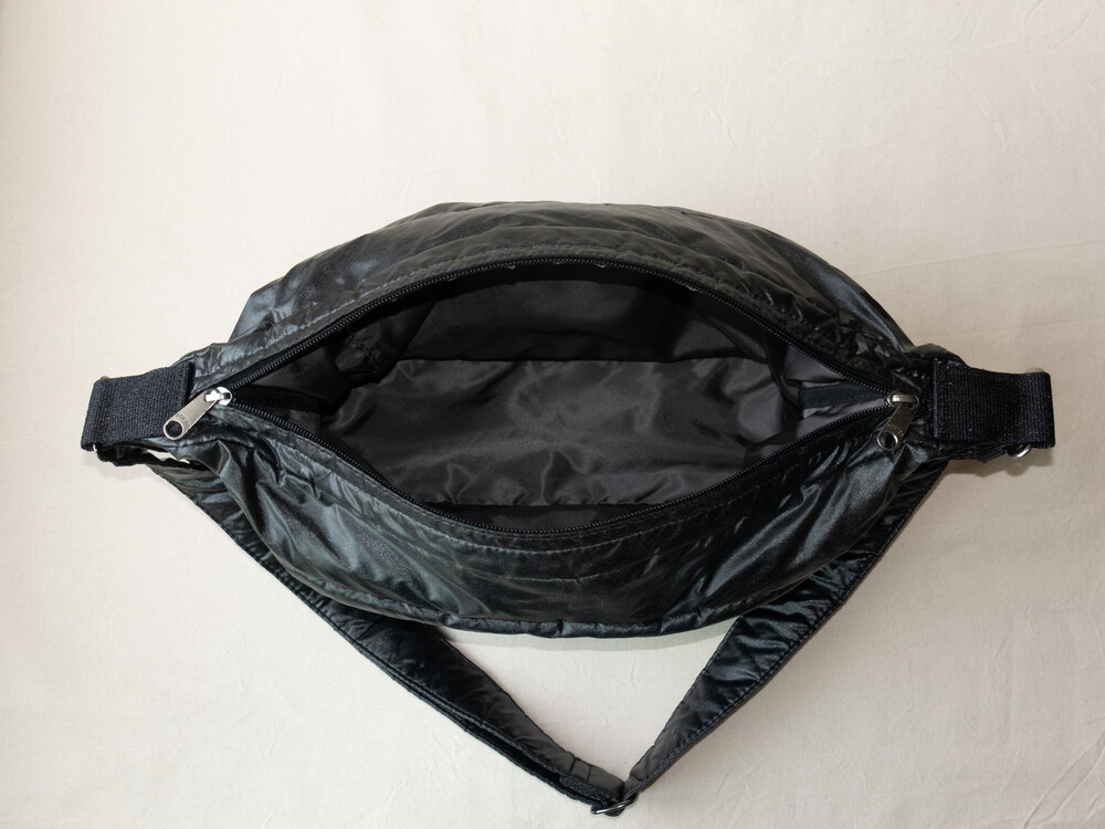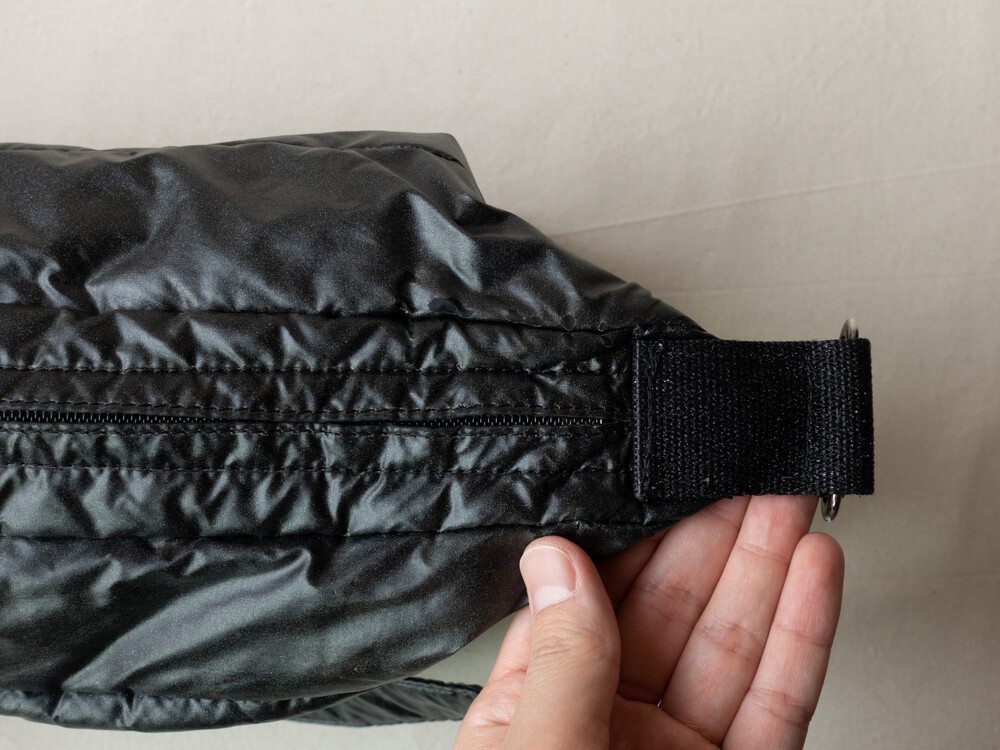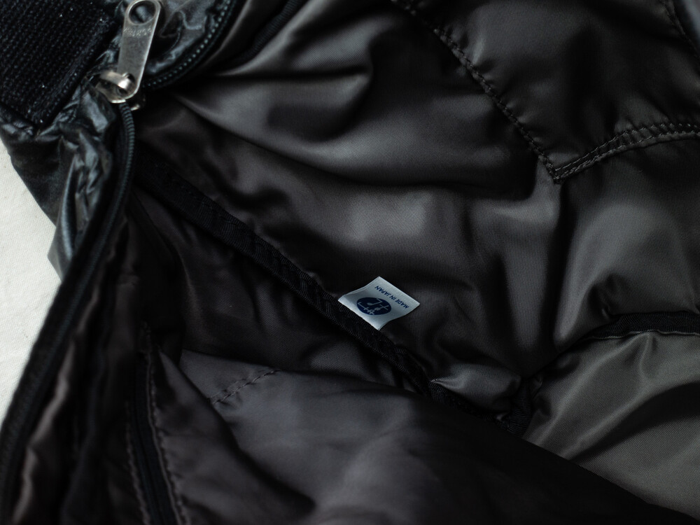 나일론 원단에 투명 폴리우레탄 코팅, 또한 블루와 레드의 광채 펄 가공을 이중으로 실시, 다시 폴리우레탄 코팅했습니다.