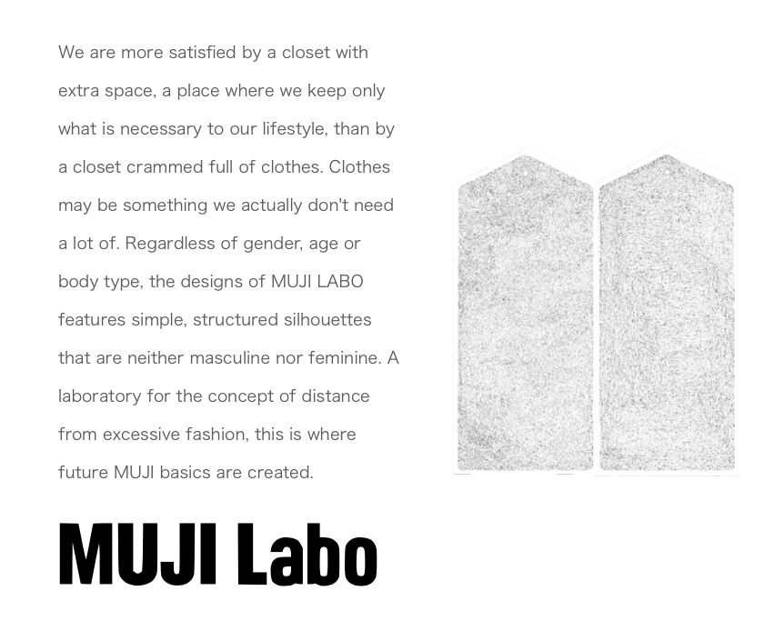 무지라보의 디자인은 성별, 연령, 체형에 상관없이 남성적이거나 여성적이지 않은 심플하고 구조적인 실루엣이 특징입니다.